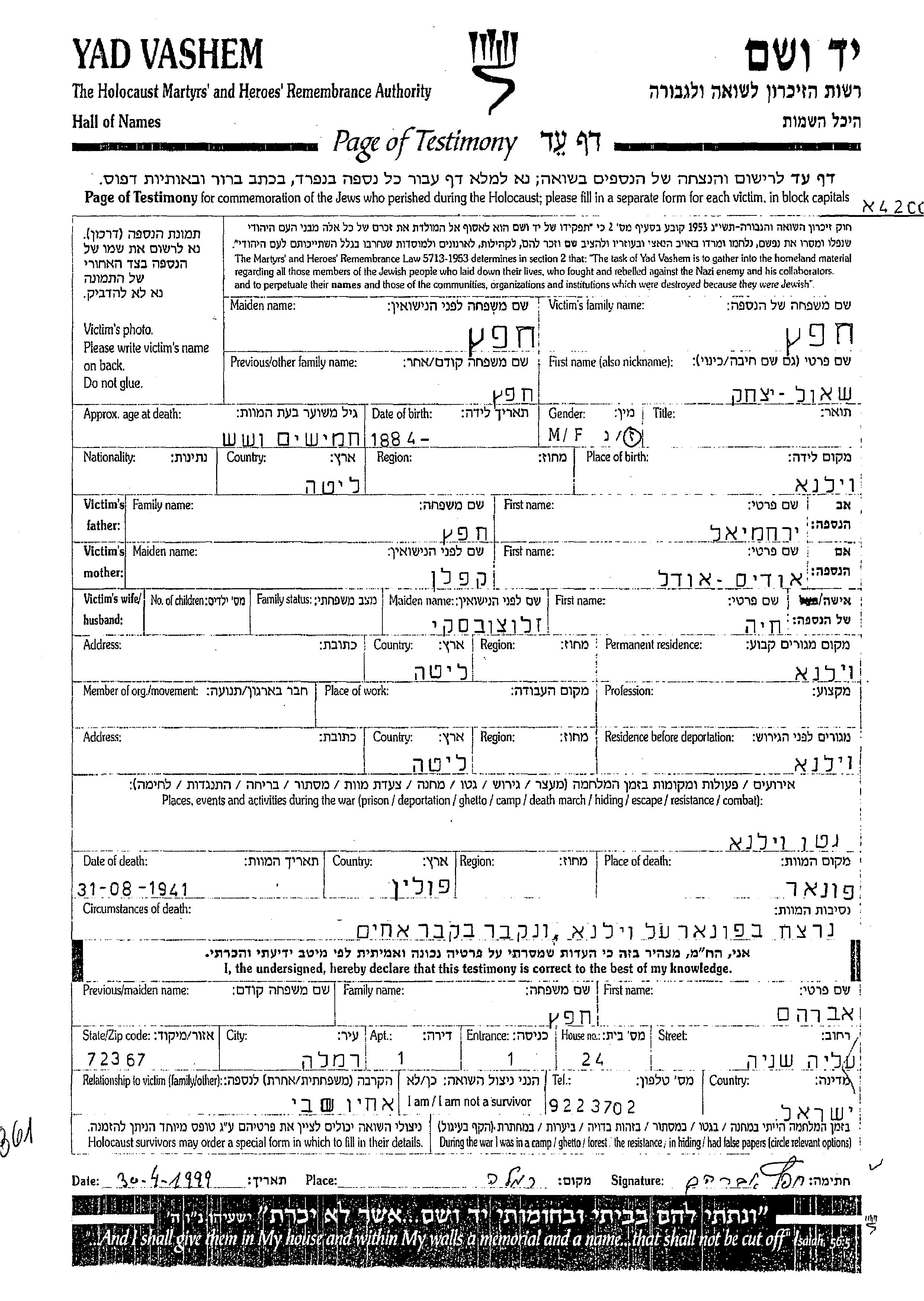 Yad Vashem - Pages of Testimony Names Memorial Collection