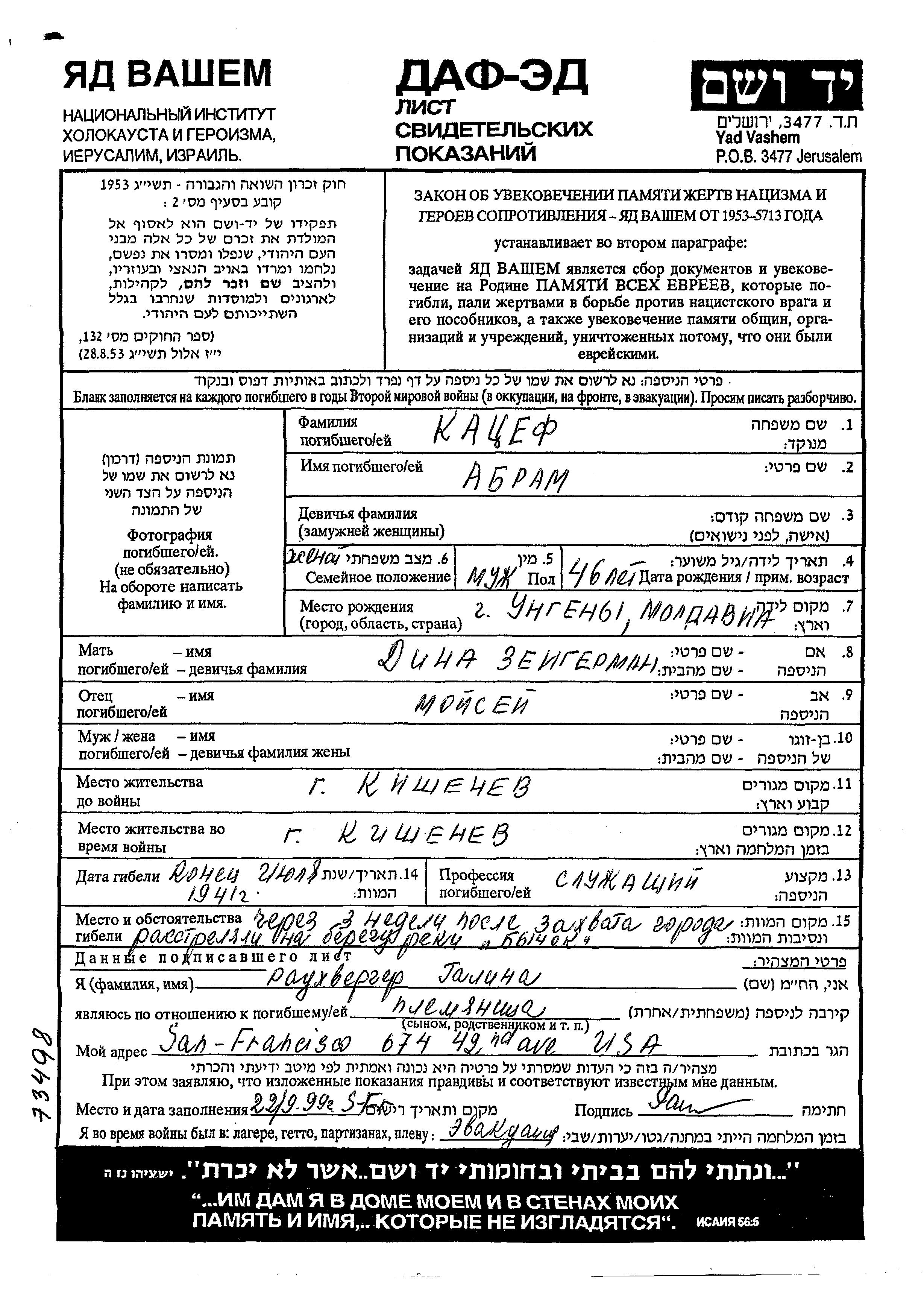 Katzef Abram Kishinev, Roumanie Feuille de témoignage