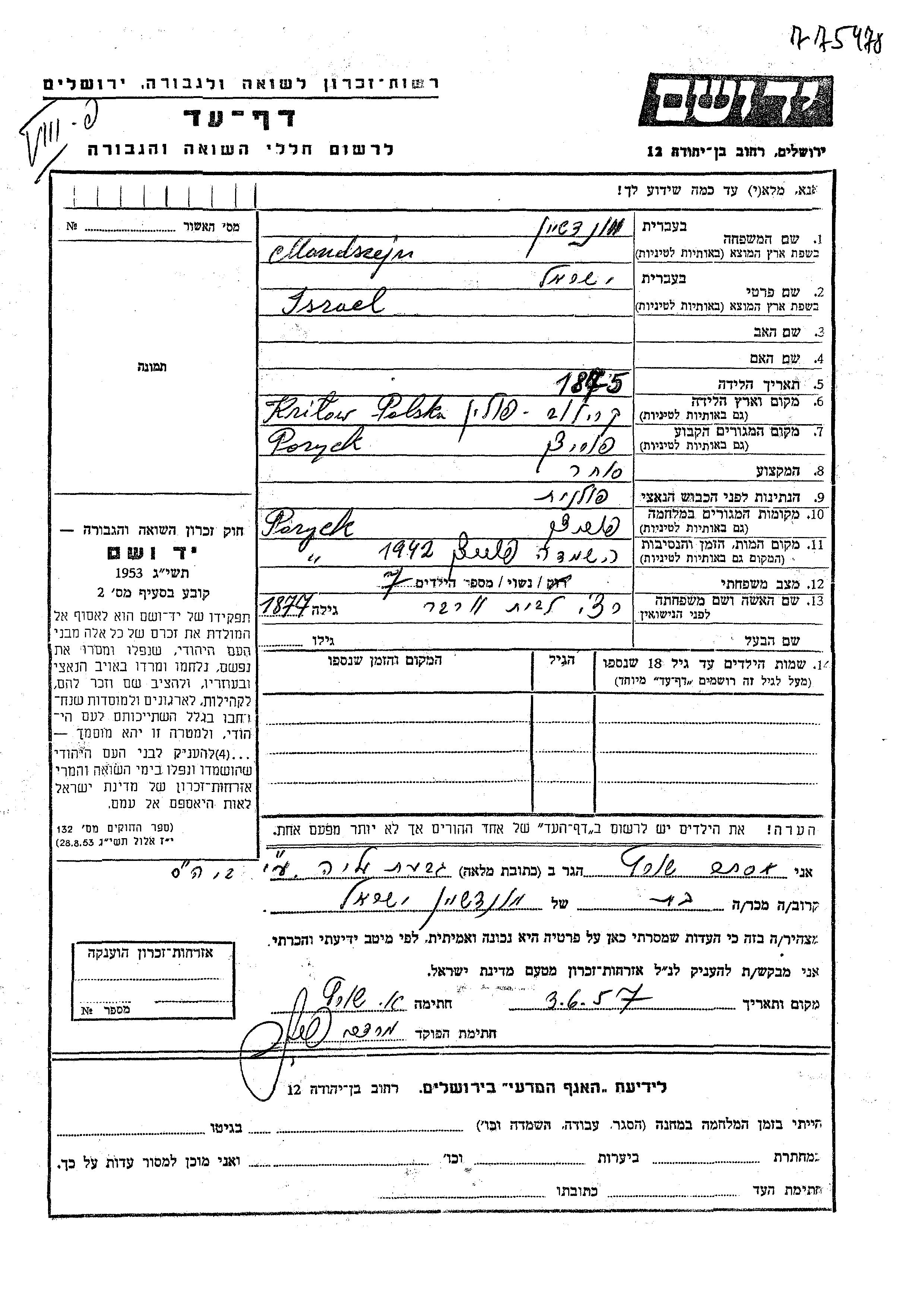 Yisrael Mondszejn est né en 1875. Avant la seconde guerre mondiale il vivait à Poryck, Pologne.