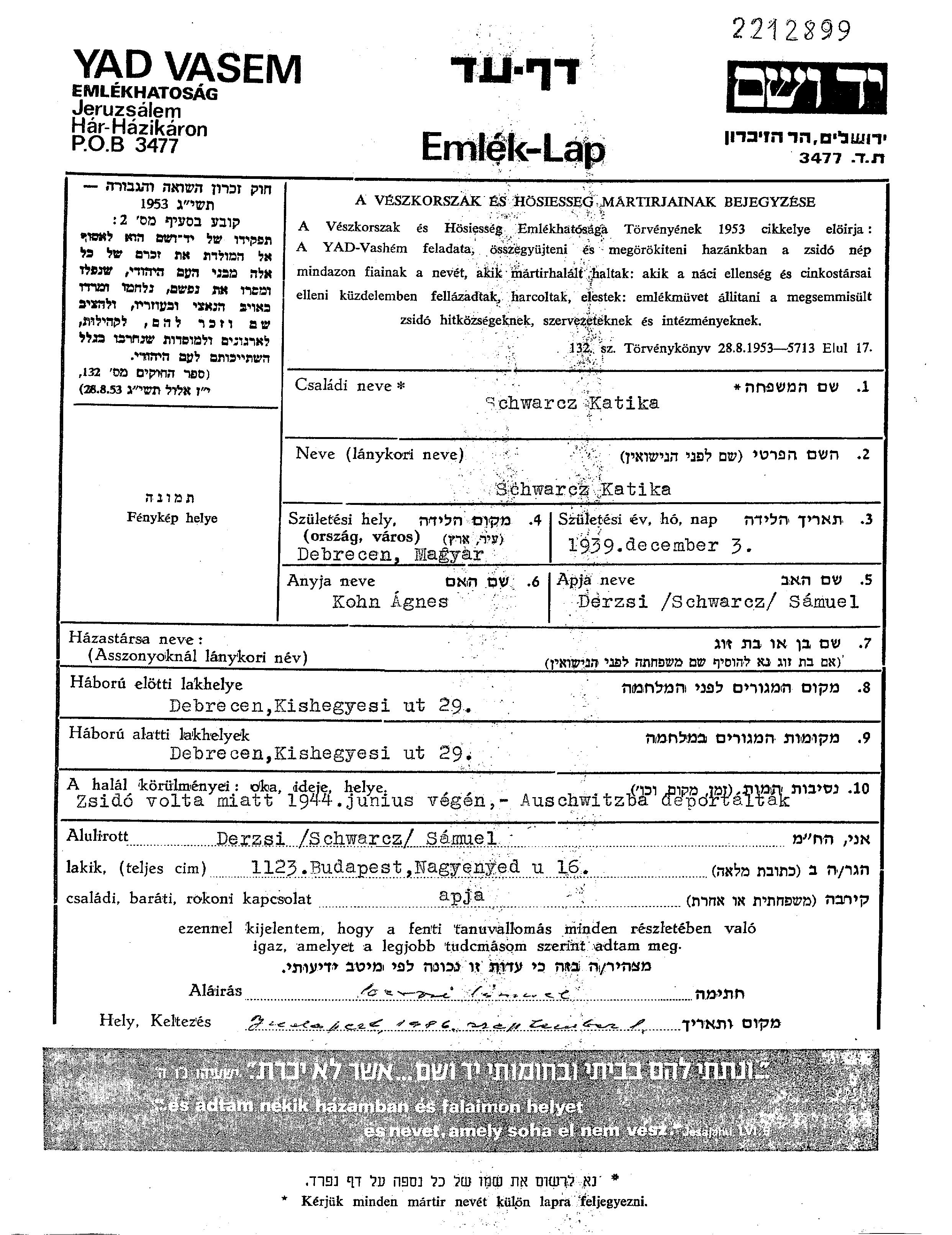 Schwarcz Katalin 1939 Debrecen, Hongrie Feuille de témoignage