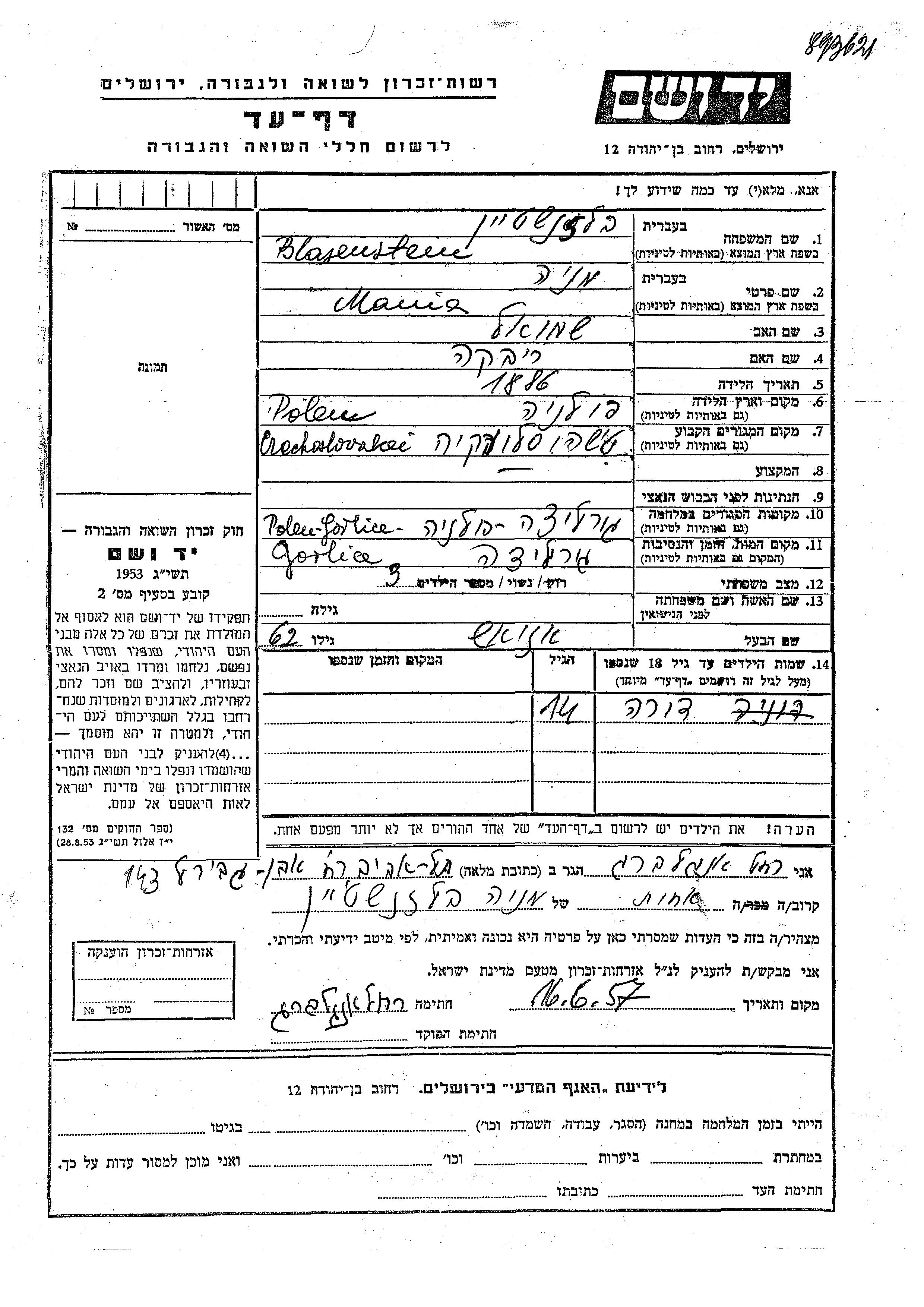 Yad Vashem - Pages of Testimony Names Memorial Collection