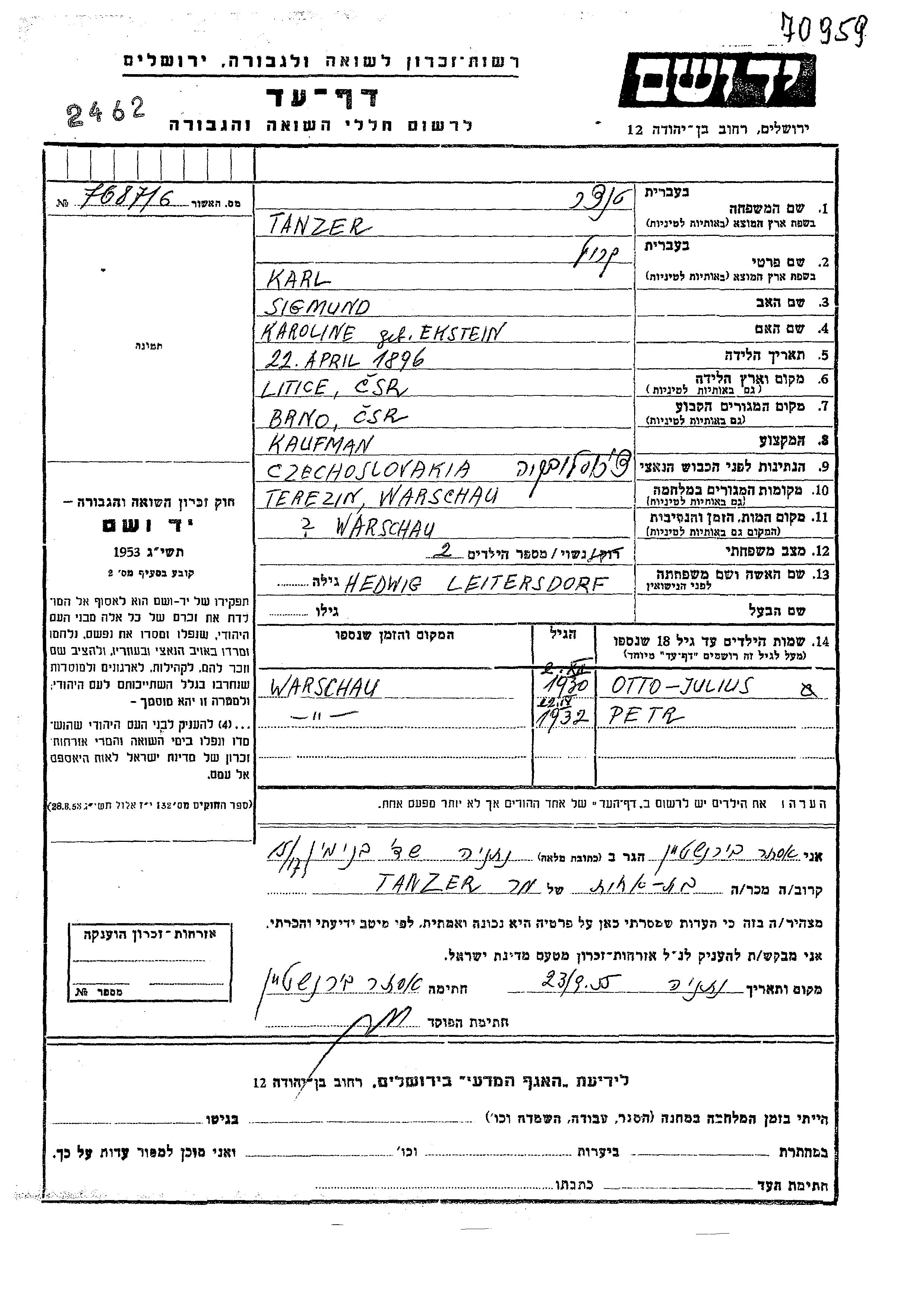Tanzer | Karel | 1896 | Brno, Tchécoslovaquie | Feuille de témoignage |