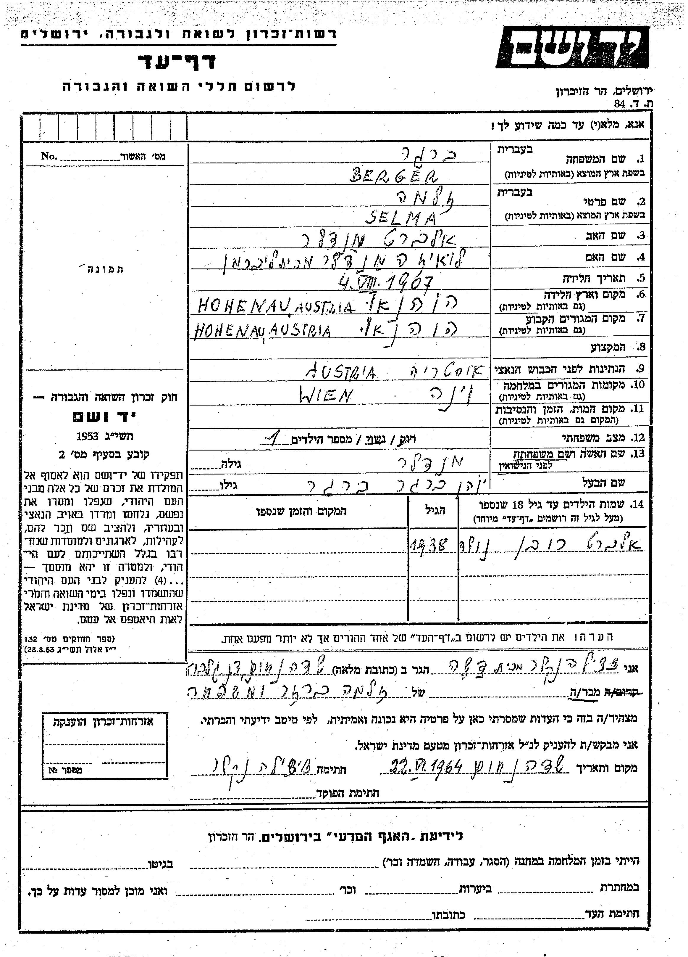Berger Albert Ruven 1938 Hohenau, Autriche Feuille de témoignage