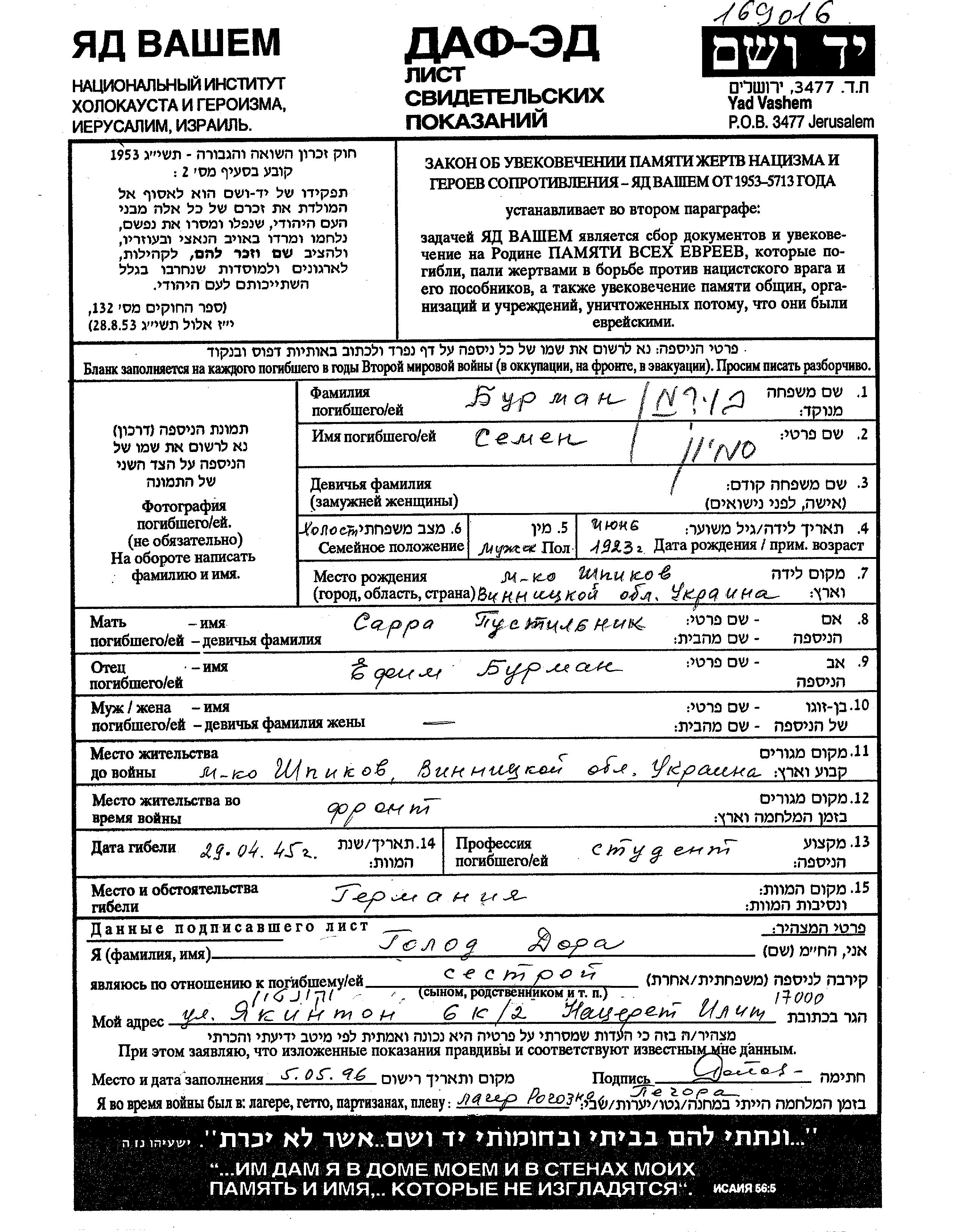Burman Semyon 1923 Shpikov, Ukraine (URSS) Feuille de témoignage