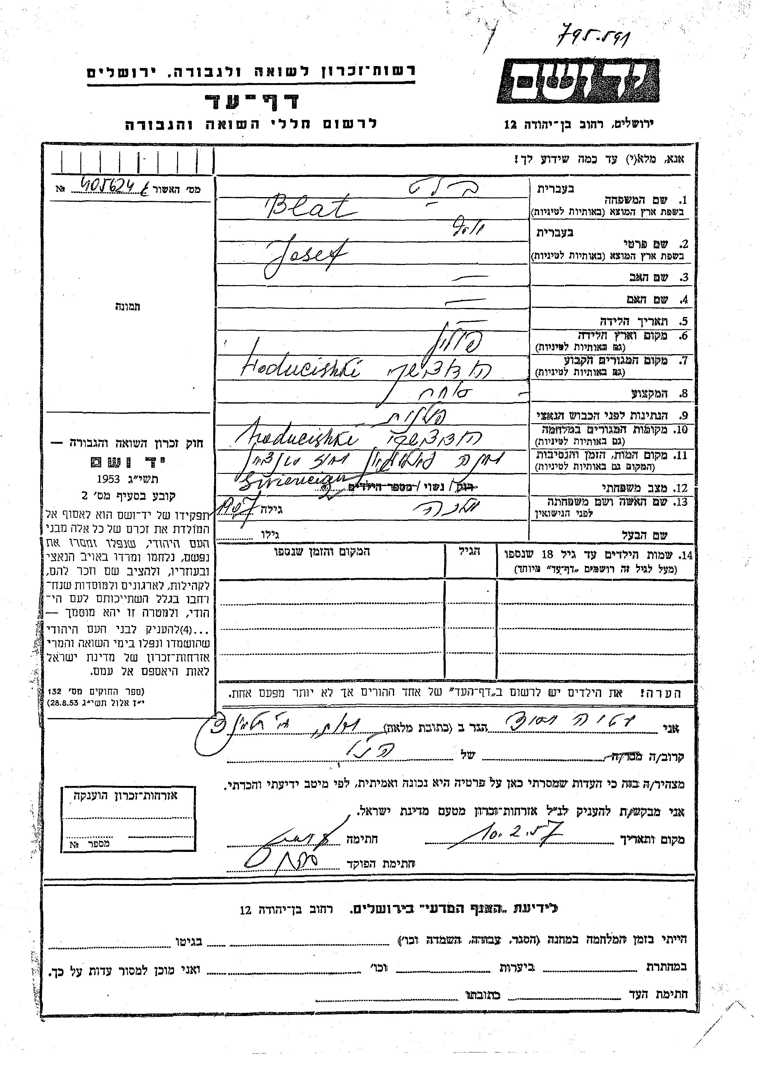 Blat Josef Hoduciszki, Pologne Feuille de témoignage