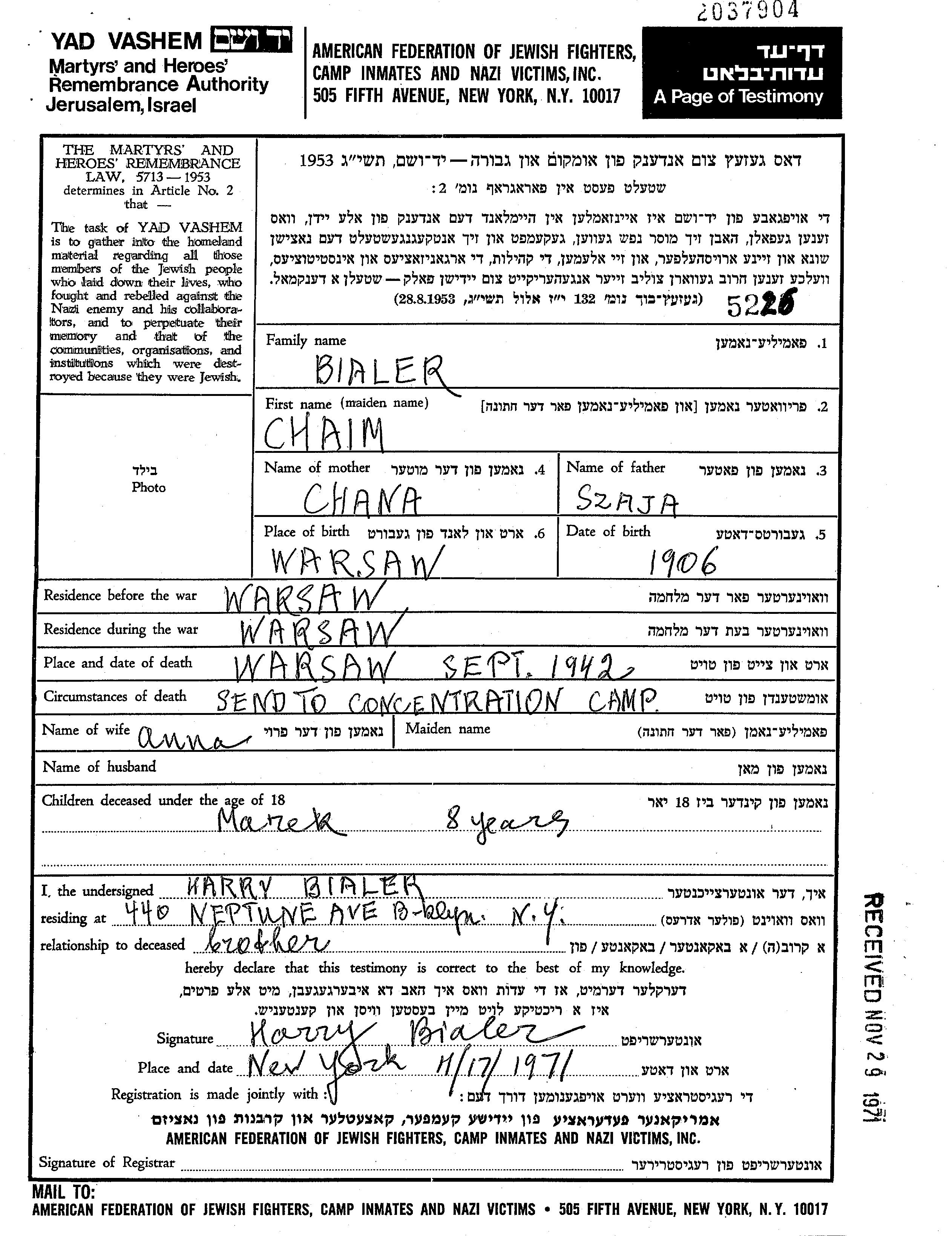 Bialer | Chaim | 1906 | Warszawa, Pologne | Feuille de témoignage |