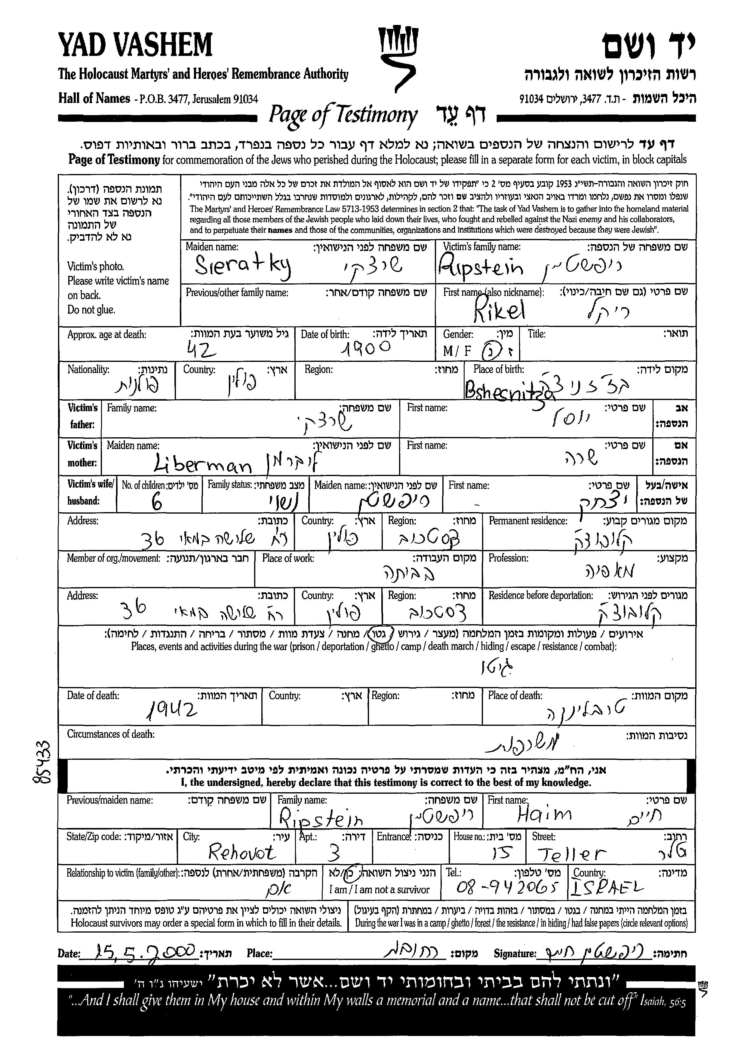 | Ripstein | Rikel | 1900 | Klobuck, Pologne | Feuille de témoignage |