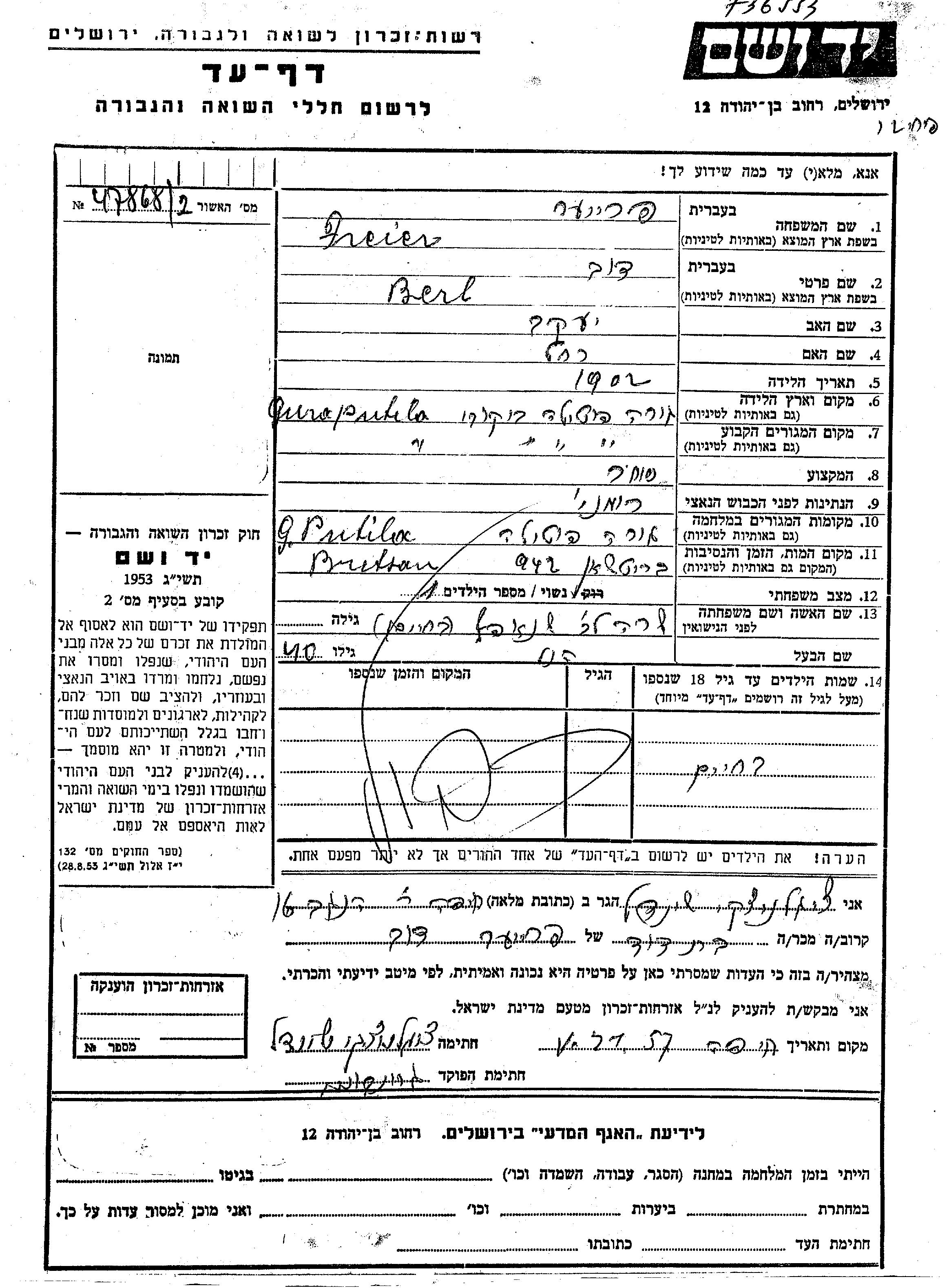 Freier | Berl | Gura Putilei, Roumanie | Feuille de témoignage |