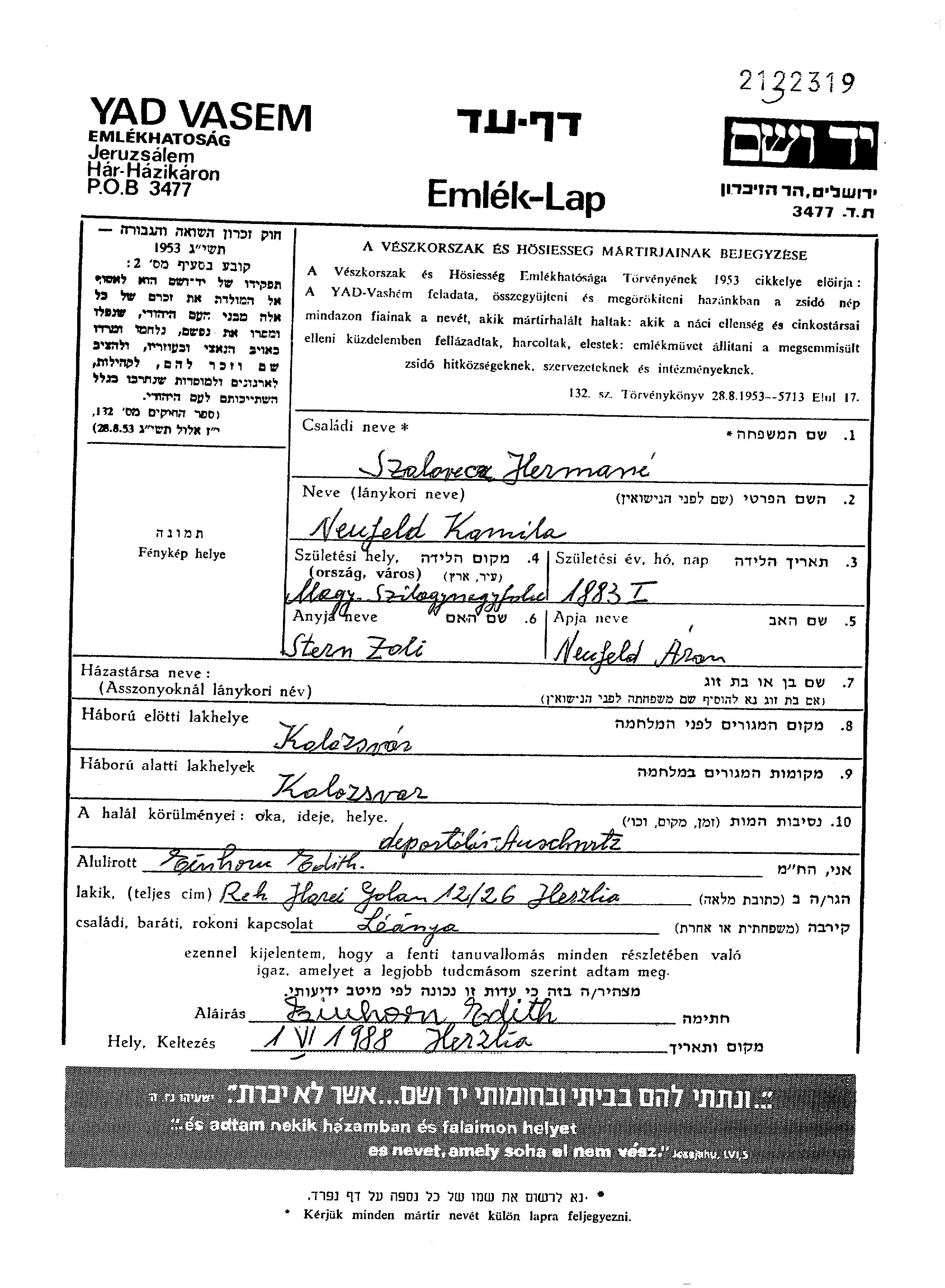 Szalowicz Kamila Kolozsvar, Roumanie Feuille de témoignage