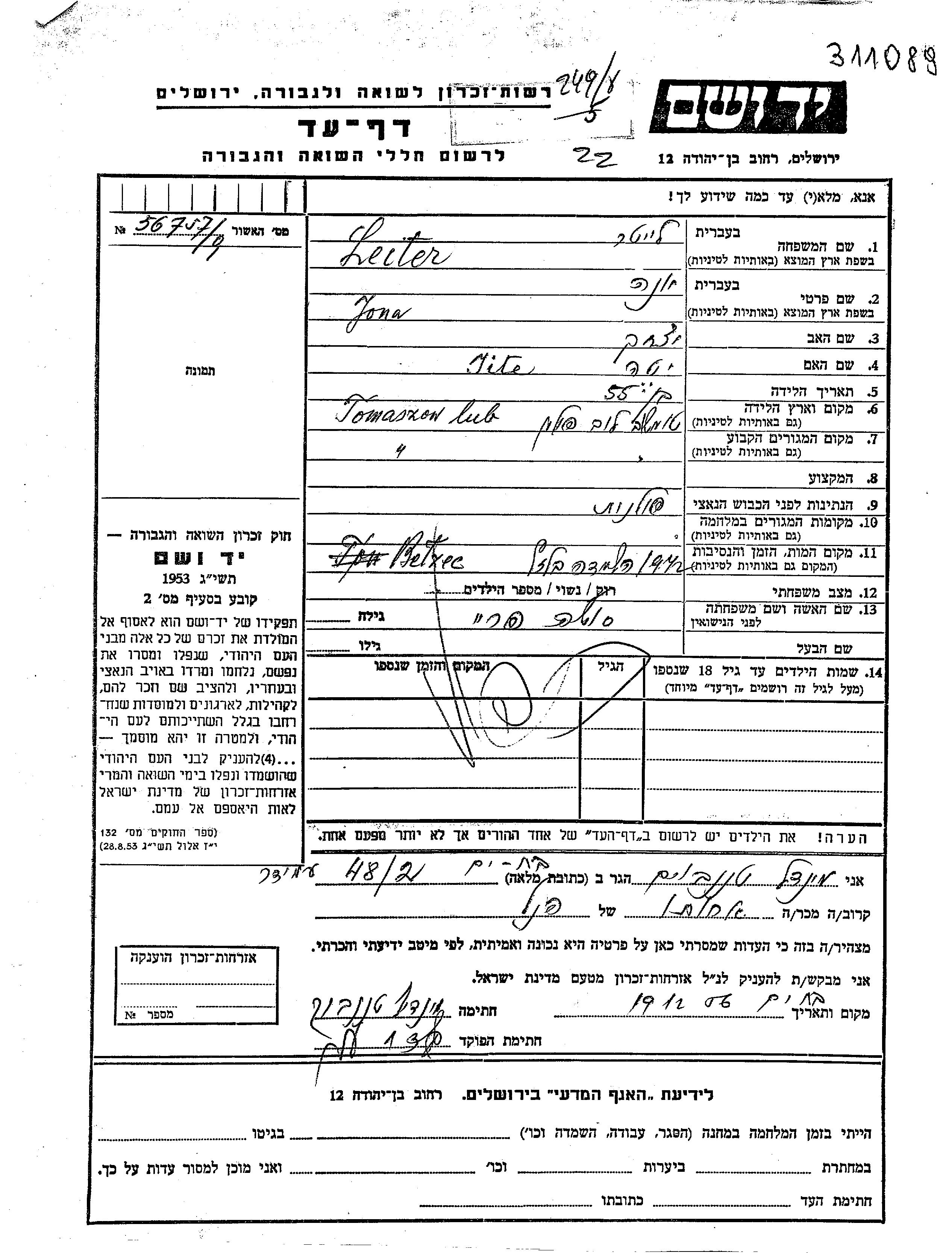 Lecter Leiter | Jona | Tomaszow, Pologne | Feuille de témoignage | |