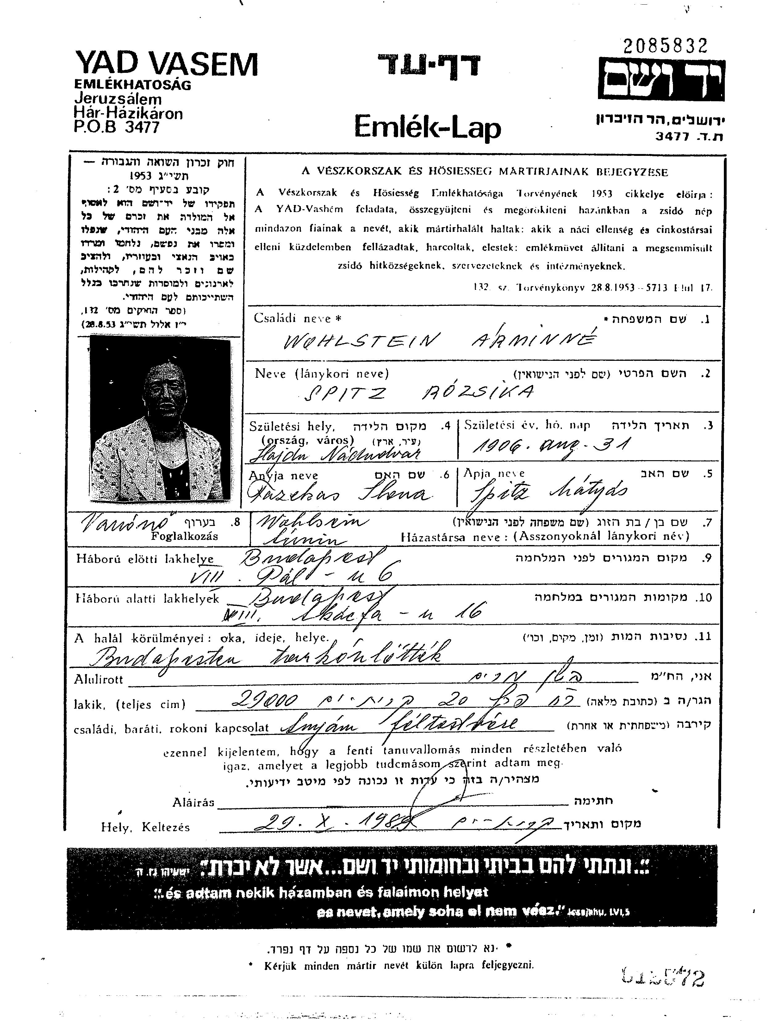 Wohlstein Rozsika 1906 Budapest, Hongrie Feuille de témoignage