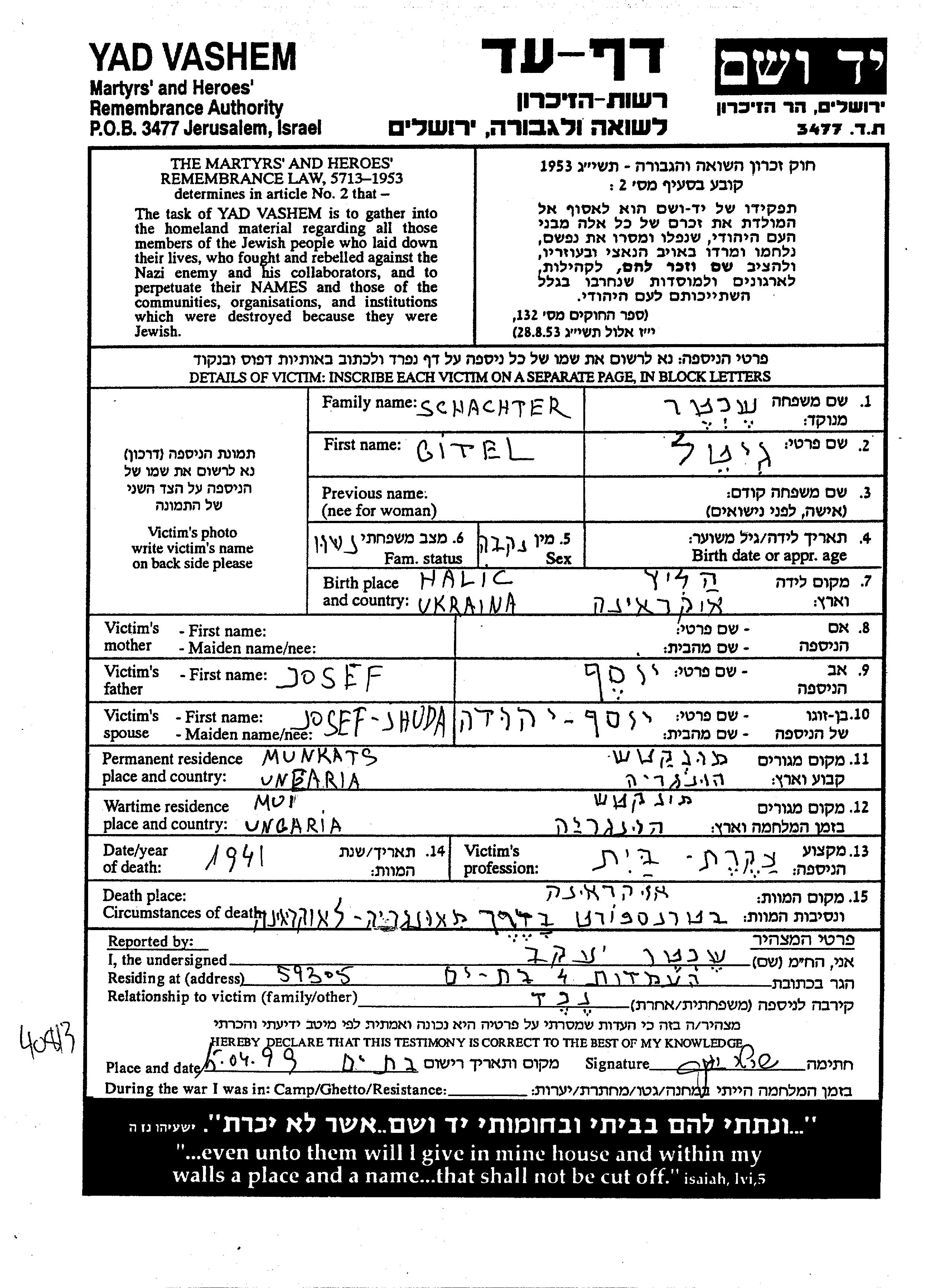 Shekhter Gitel Munkacz, Tchécoslovaquie Feuille de témoignage (digitale)