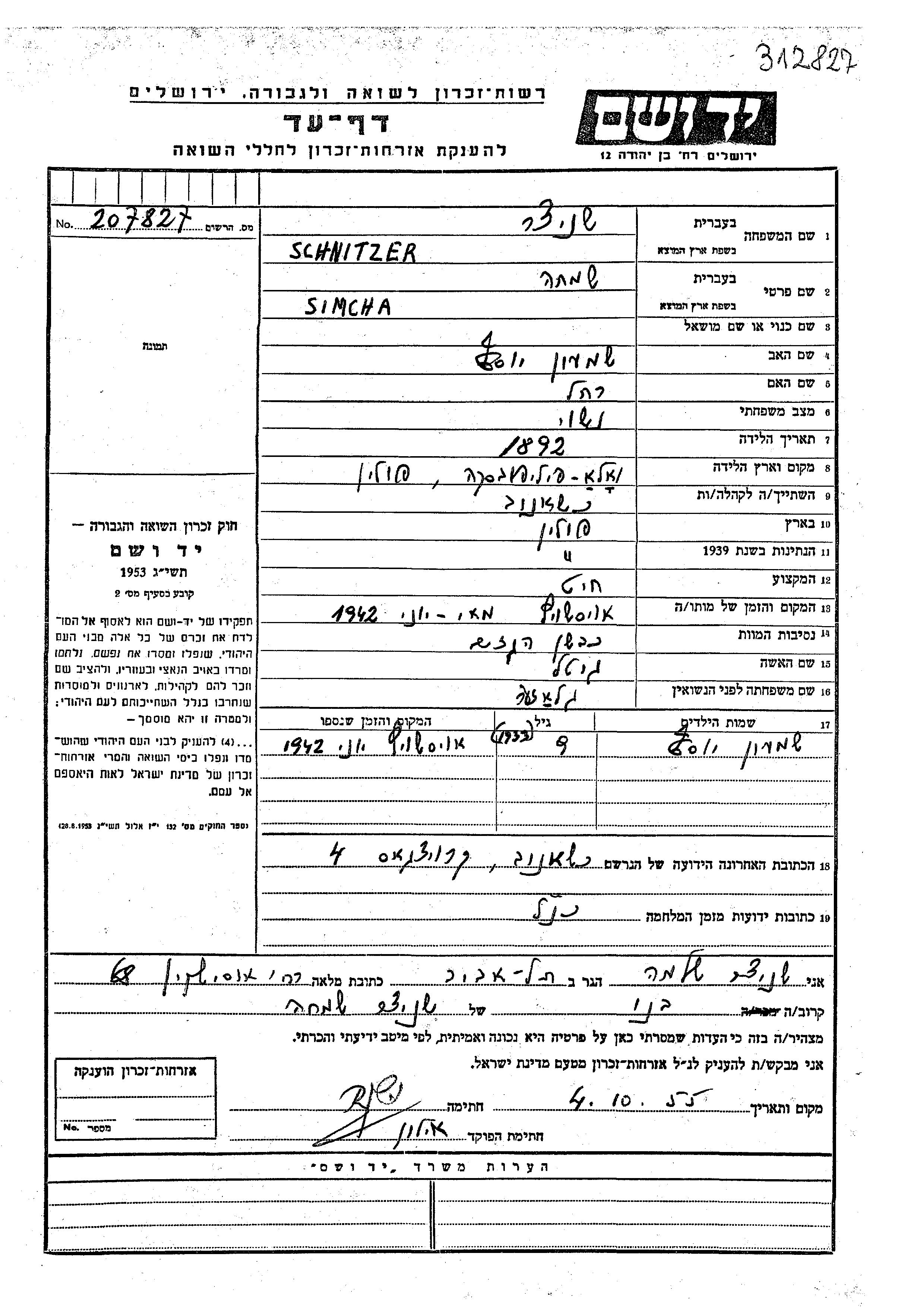 Schnitzer Simcha 1892 Chrzanow, Pologne Feuille de témoignage