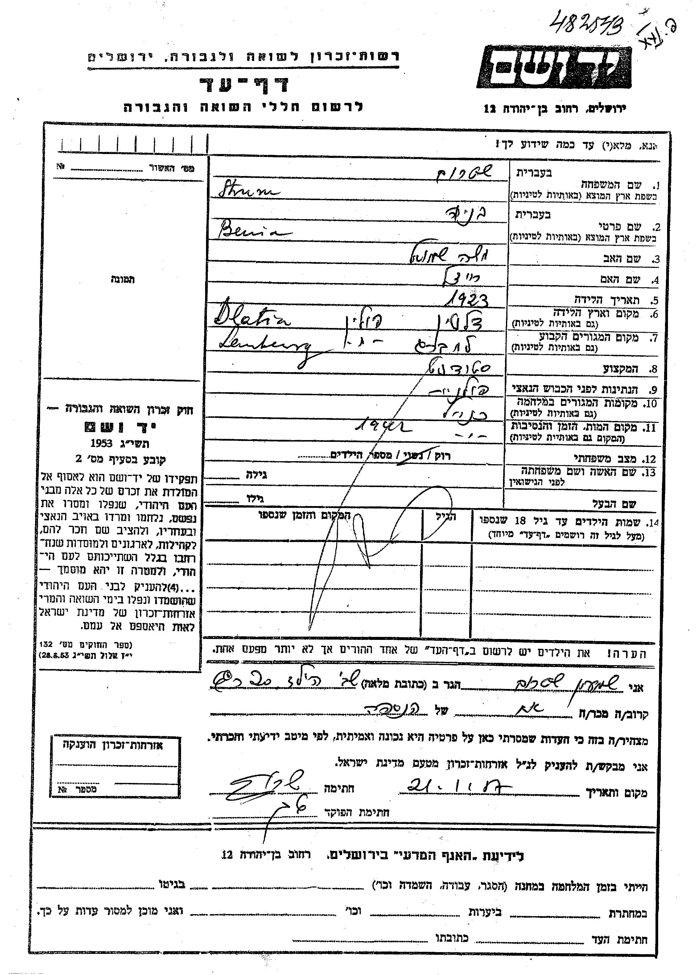 Benia Strum Shtrum est né en 1923. Il était Étudiant/e. Avant la seconde guerre mondiale il vivait à Lwow, Pologne.