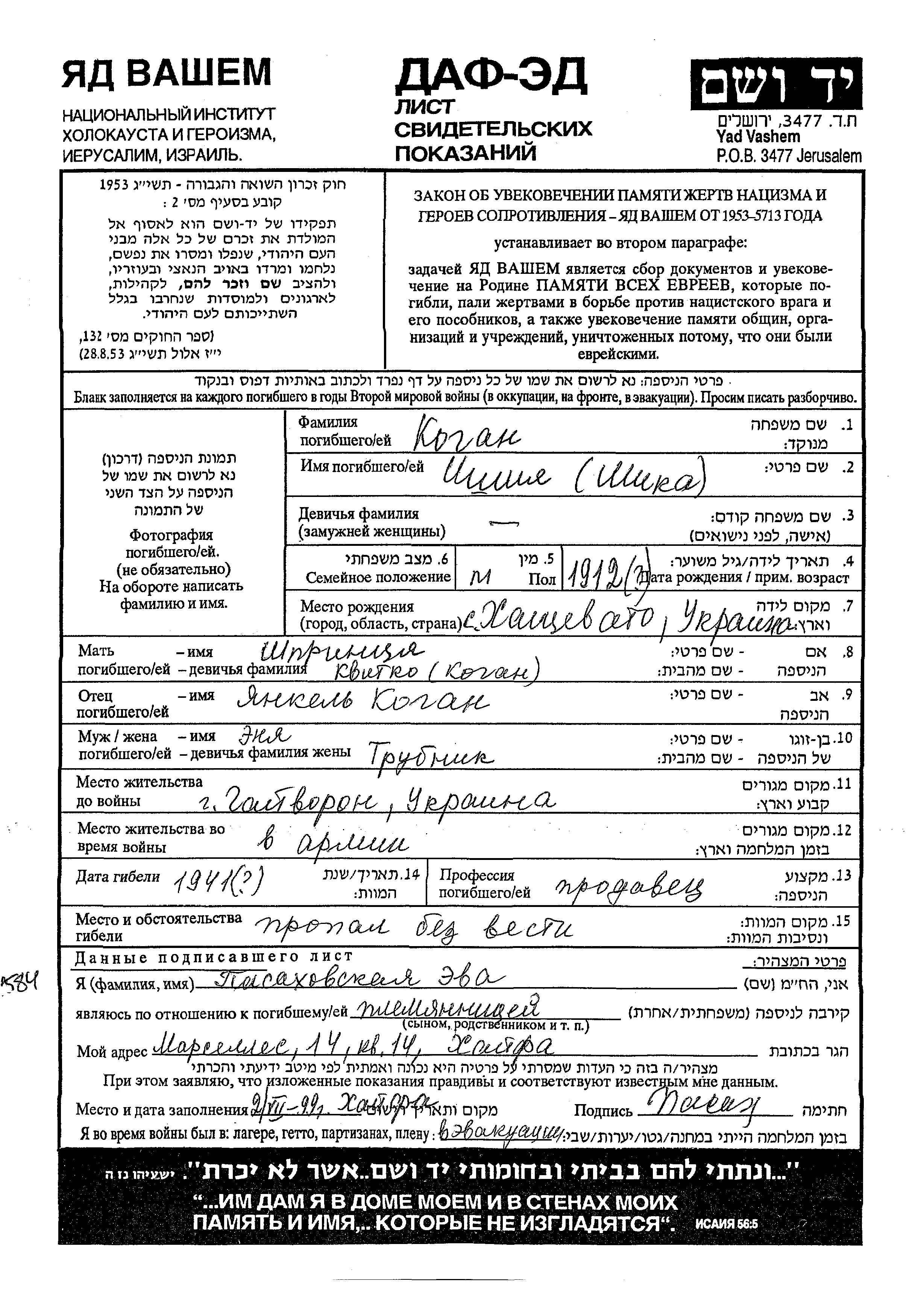 Kogan Ishiya 1912 Gaivoron, Ukraine (URSS) Feuille de témoignage