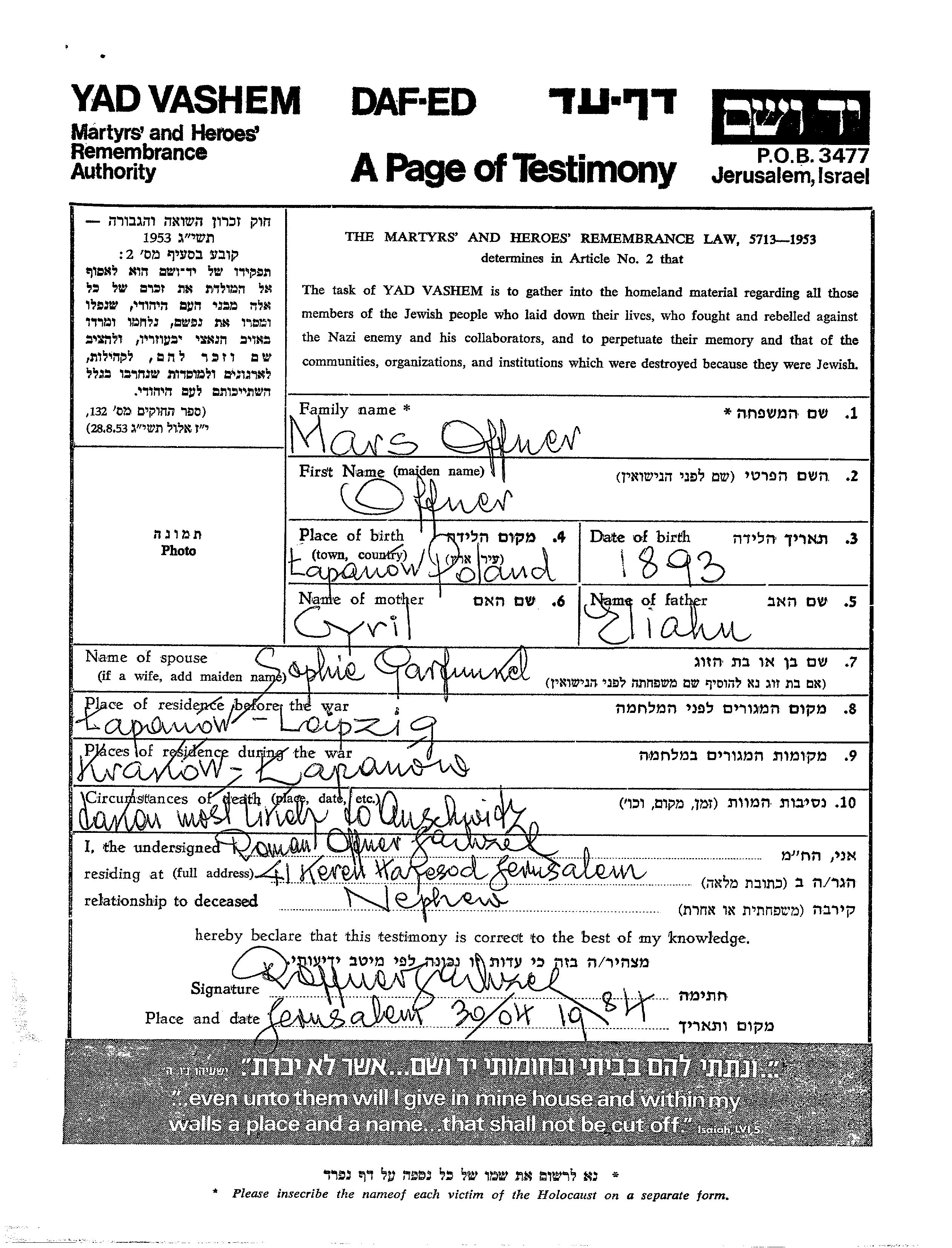 Yad Vashem - Pages of Testimony Names Memorial Collection