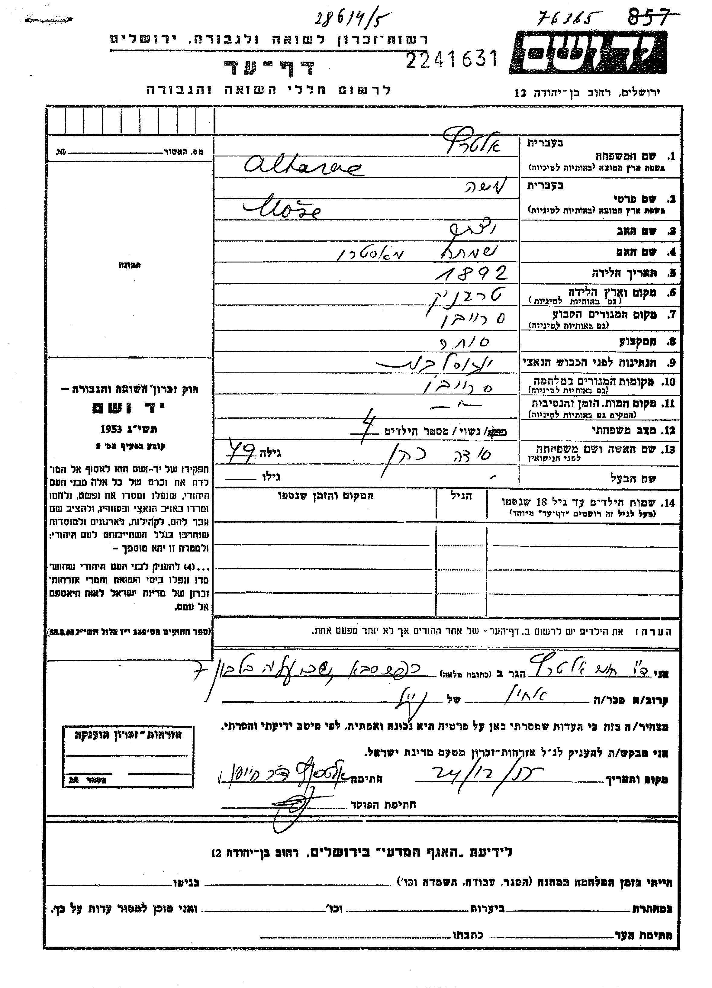 Altarac | Mose | 1892 | Sarajevo, Yugoslavie | Feuille de témoignage |