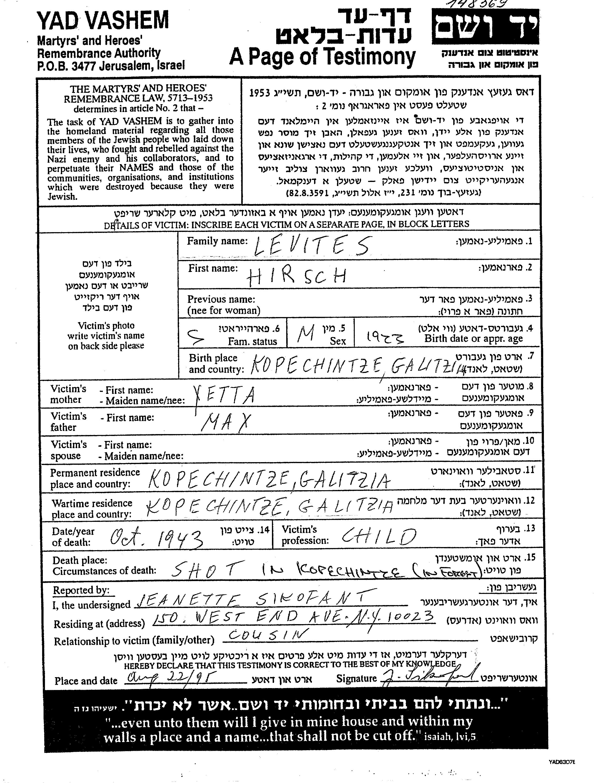 Hirsh Levites est né à Kopyczynce, Pologne en 1923. Il était Élève. Avant la seconde guerre mondiale il vivait à Kopyczynce, Pologne.