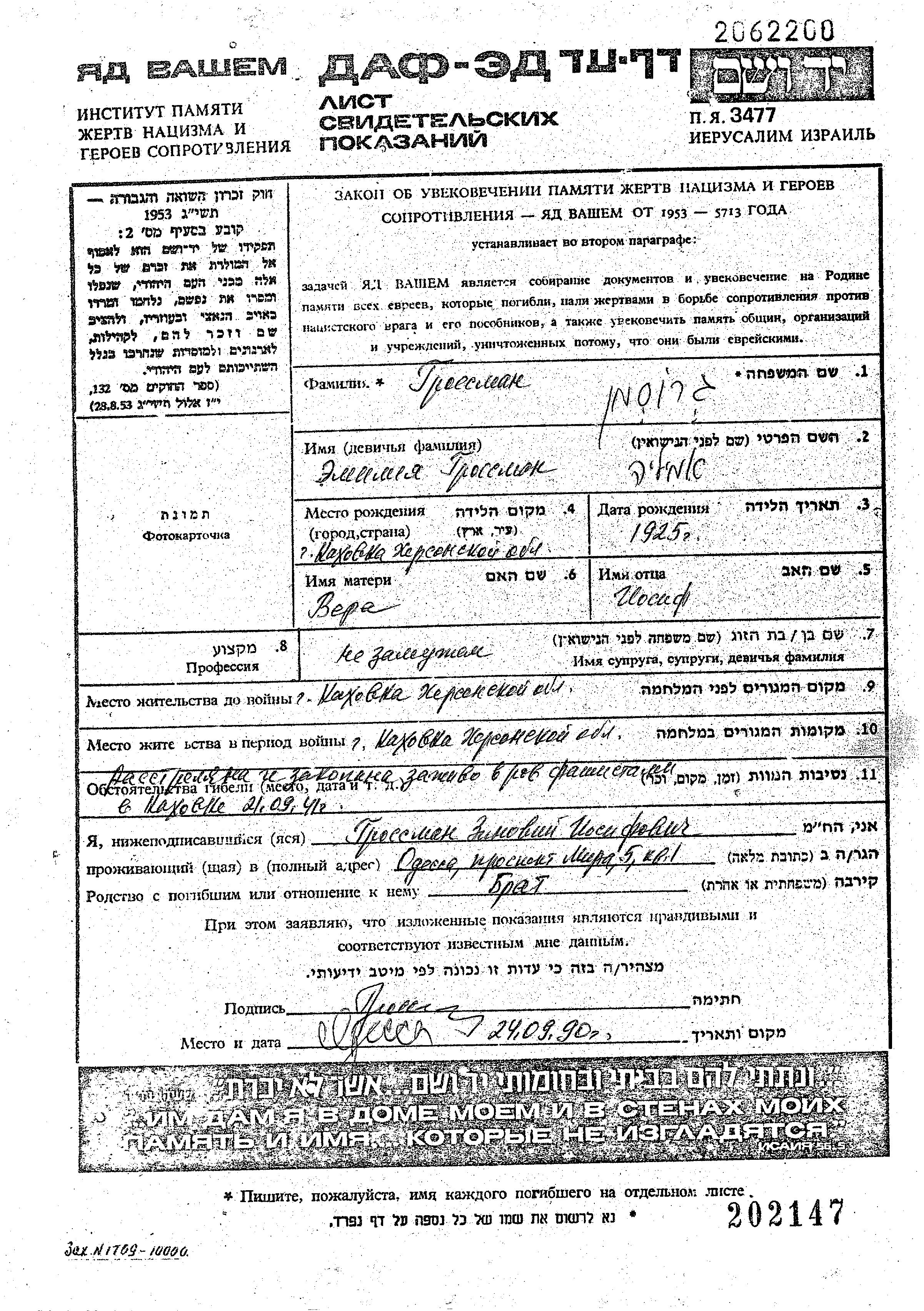 Grossman | Emiliya | 1925 | Kakhovka, Ukraine (URSS) | Feuille de témoignage |