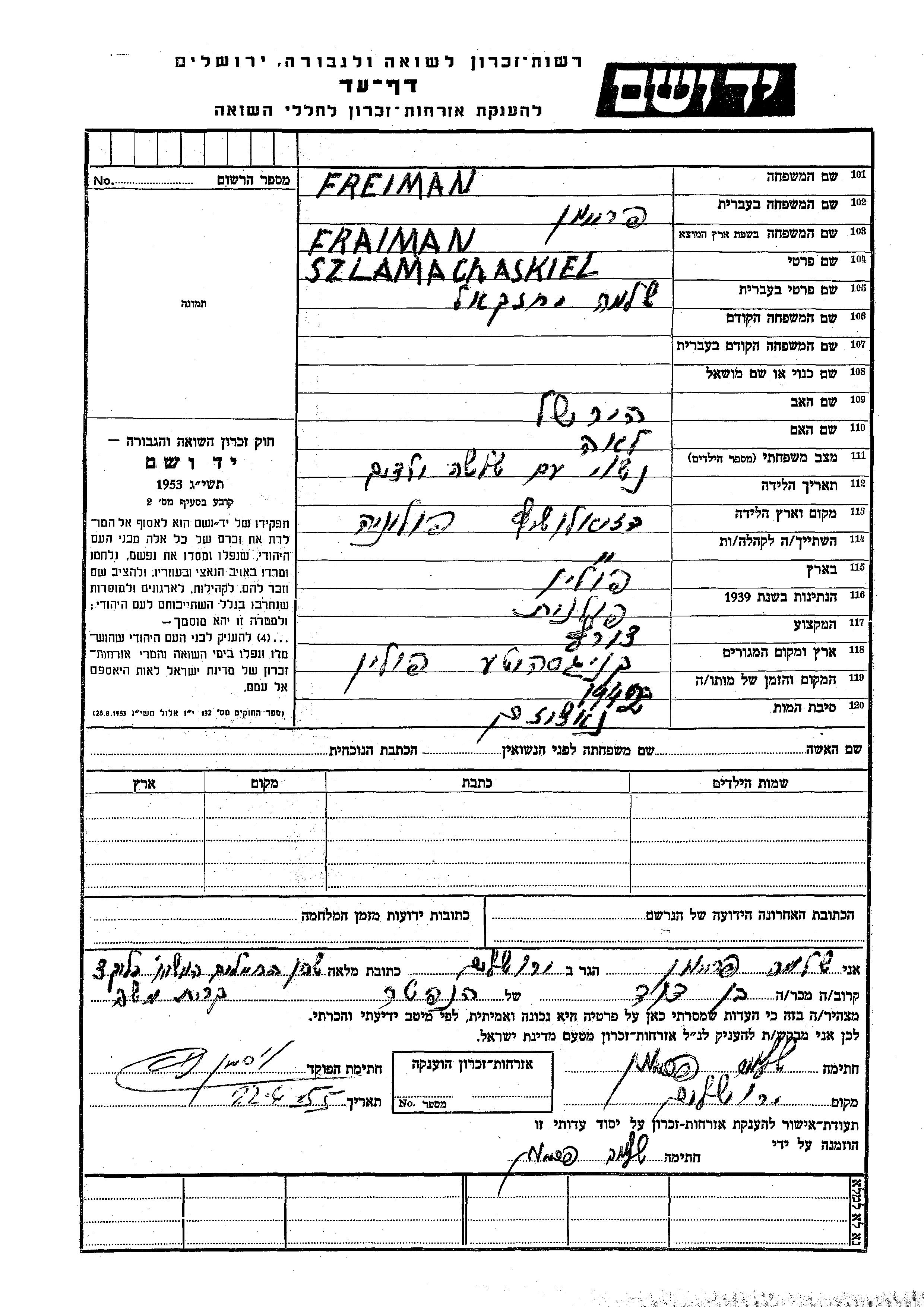 Frajman Shlomo Yekhezkel 1904 Chorzów, Pologne Feuille de témoignage