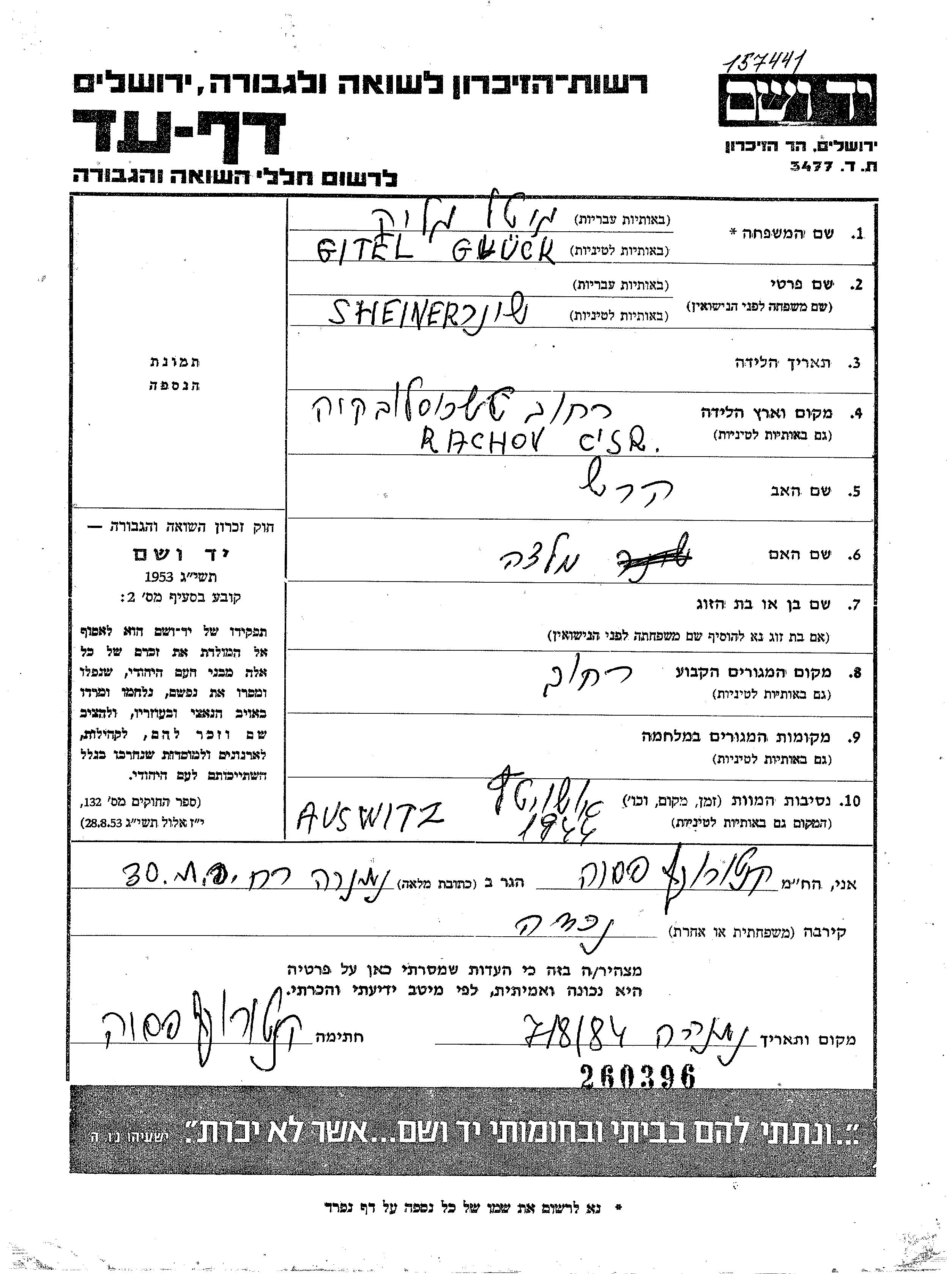 Glueck Gitel Rachov, Tchécoslovaquie Feuille de témoignage