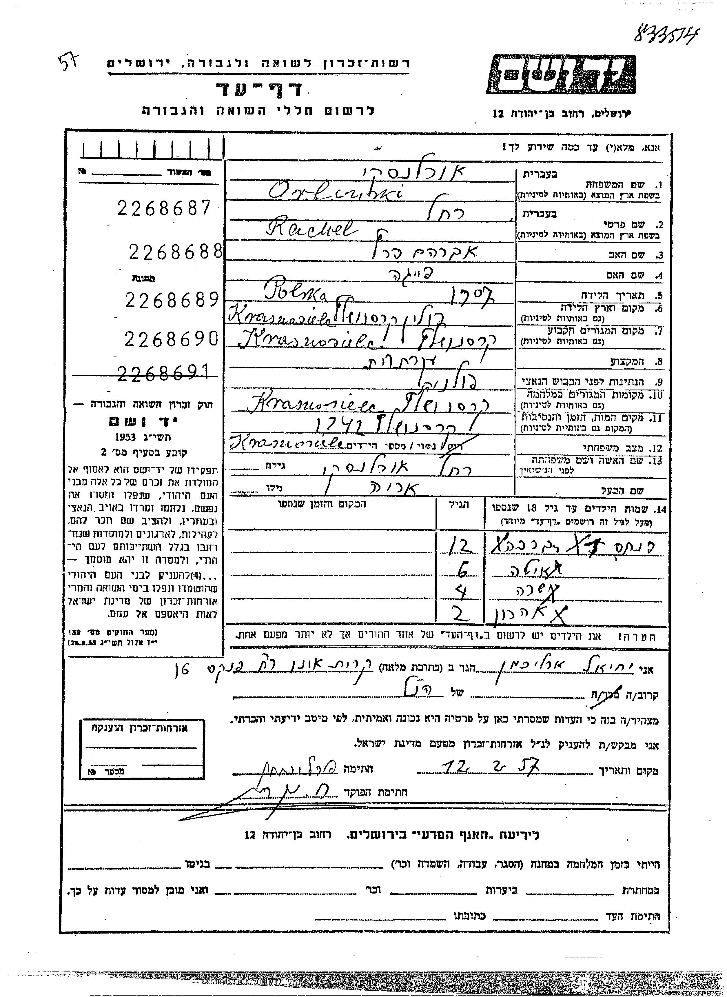 Orlanski Rachel 1907 Krasnosielc, Pologne Feuille de témoignage
