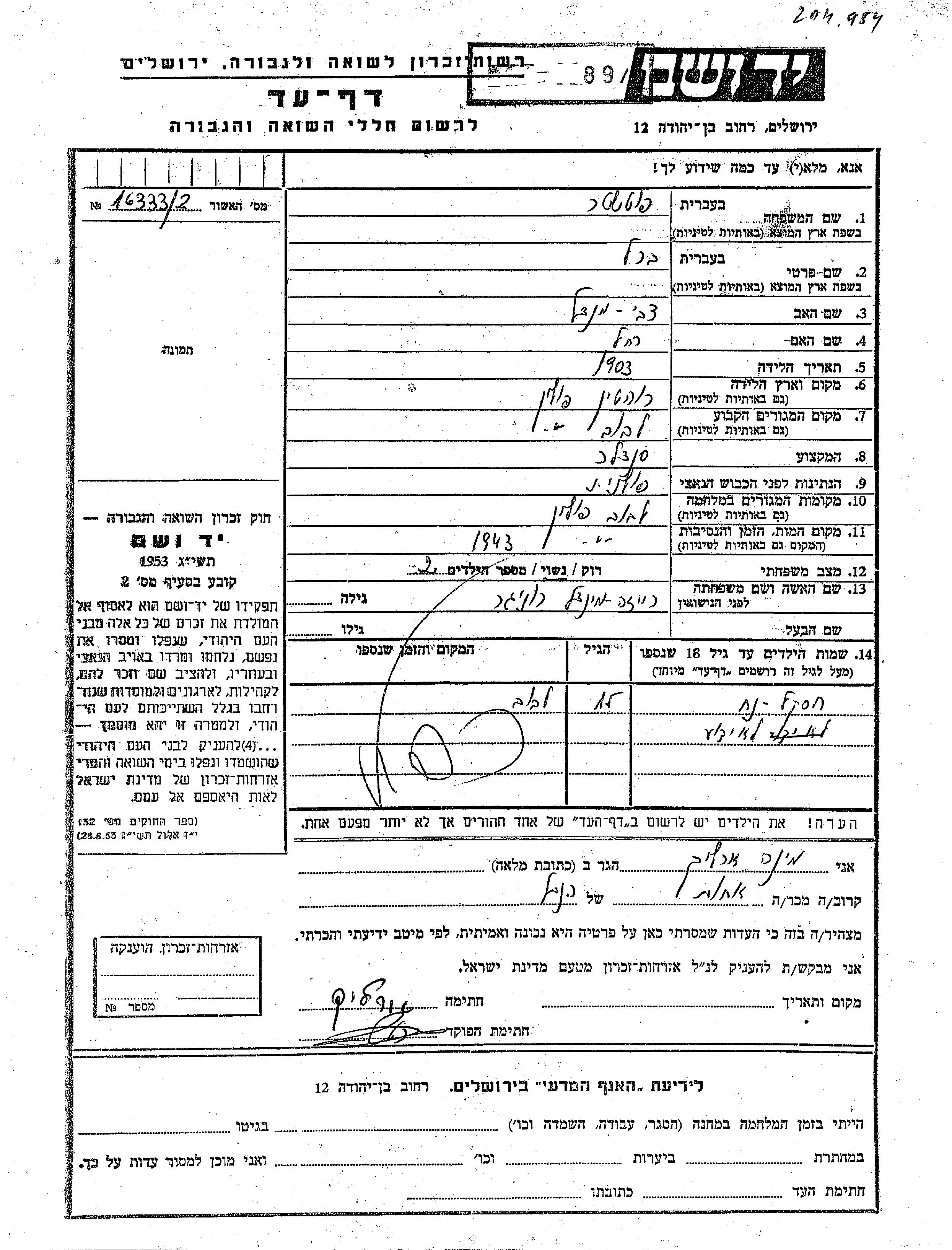 Yad Vashem - Pages of Testimony Names Memorial Collection