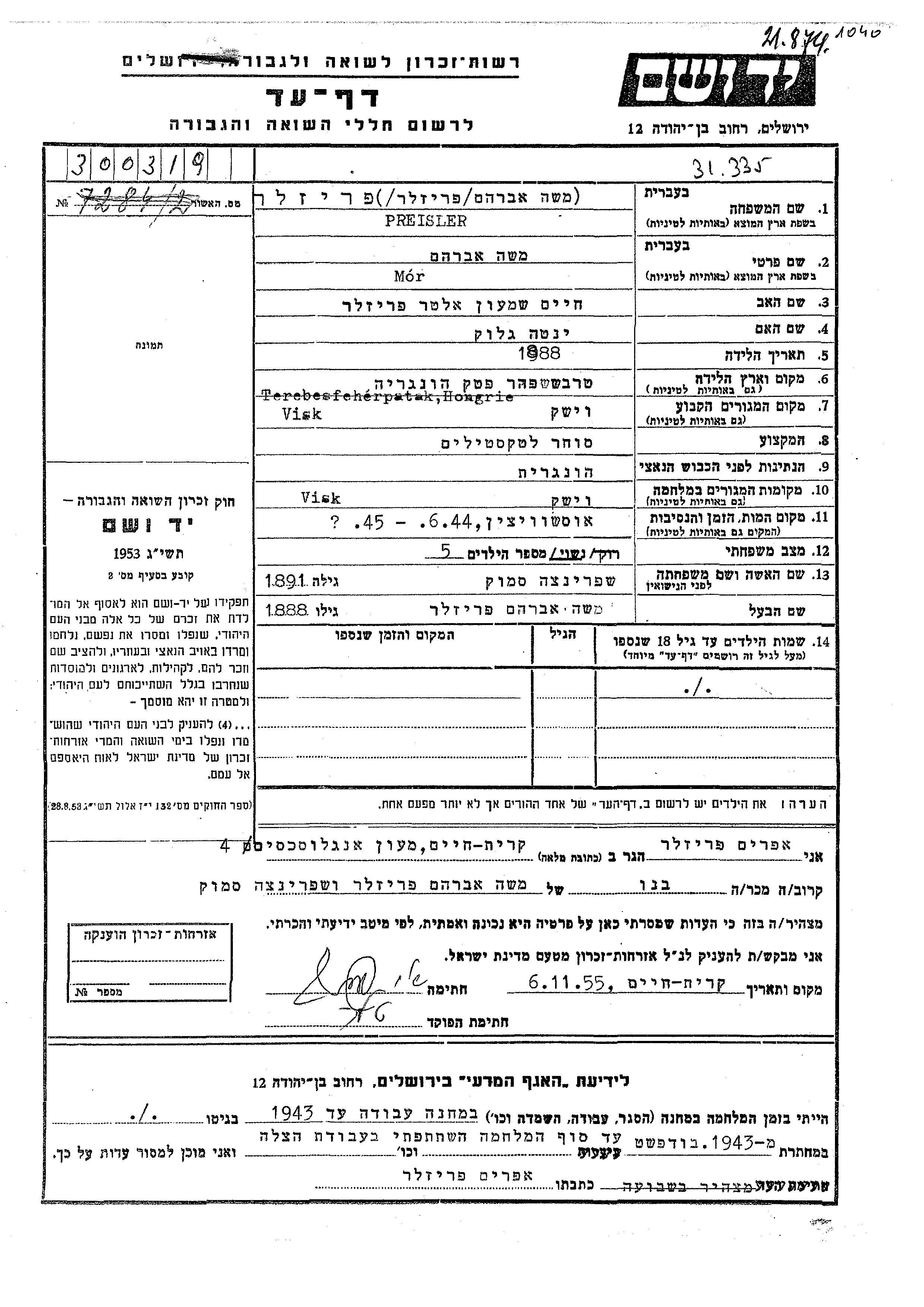 Preisler Frizler Mor Moshe Avraham 1888 Visk, Tchécoslovaquie Feuille de témoignage