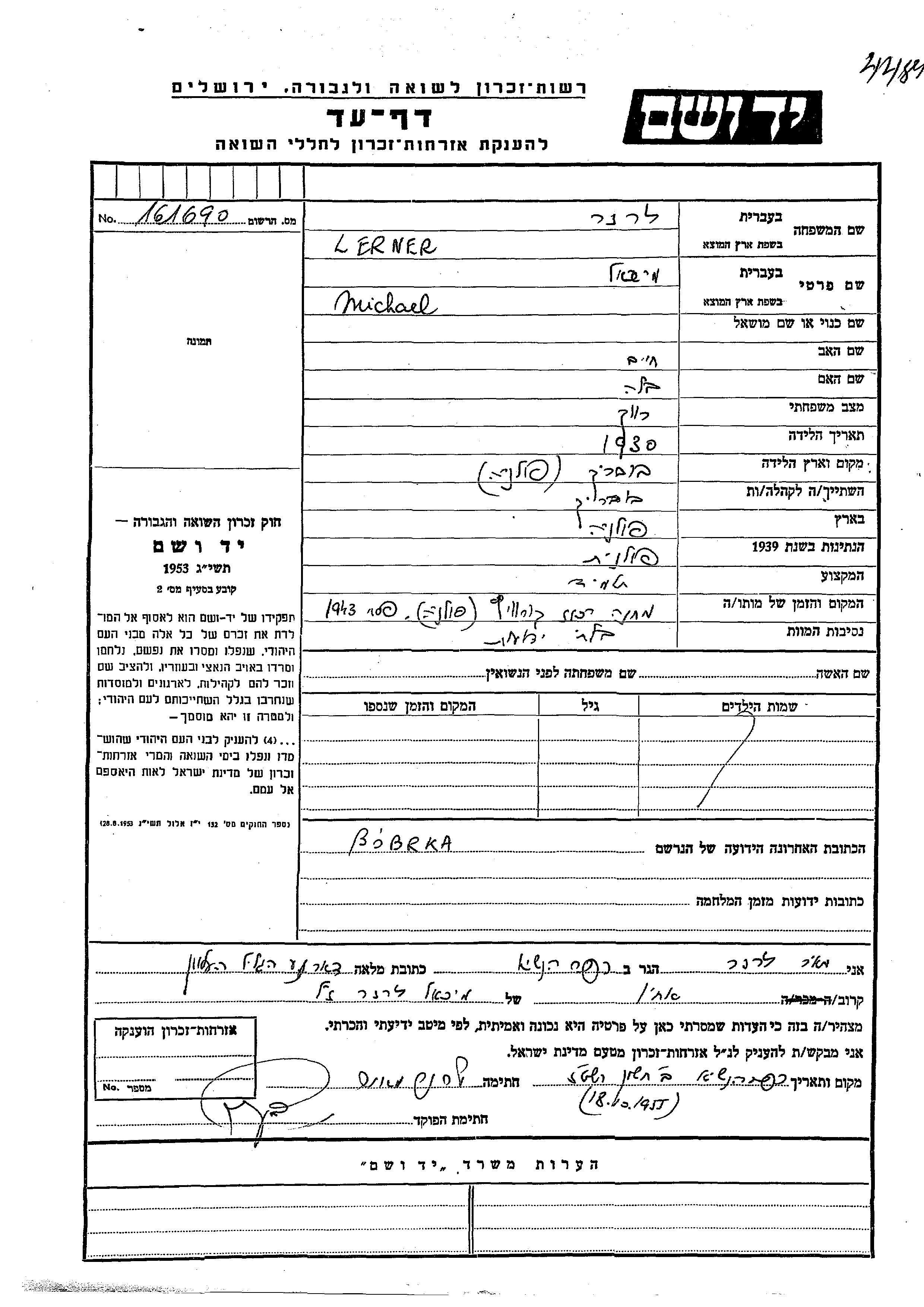 Lerner Michael 1930 Bibrka, Pologne Feuille de témoignage