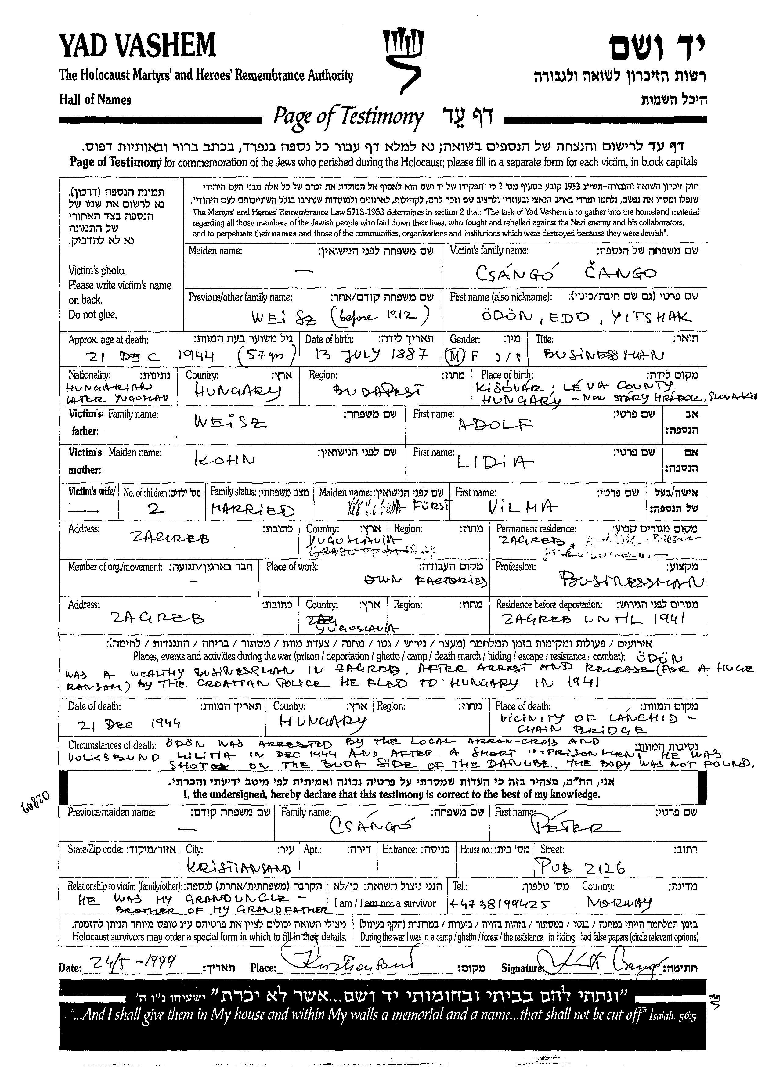 Csango Weisz | Odon Edo Yitshak | 1887 | Zagreb, Yugoslavie | Feuille de témoignage |