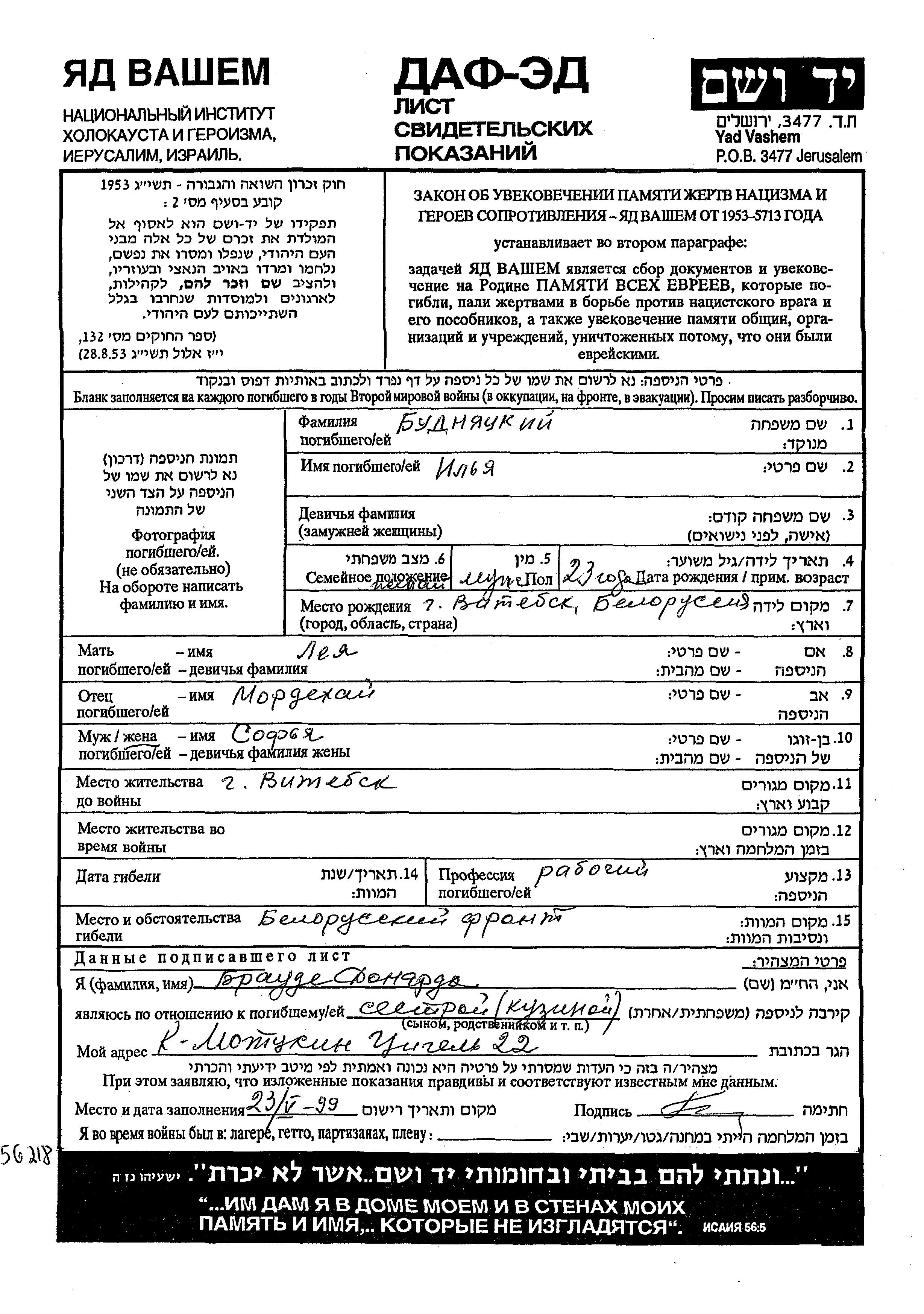 Budnyatzki Ilya Vitebsk, Bélorussie (URSS) Feuille de témoignage