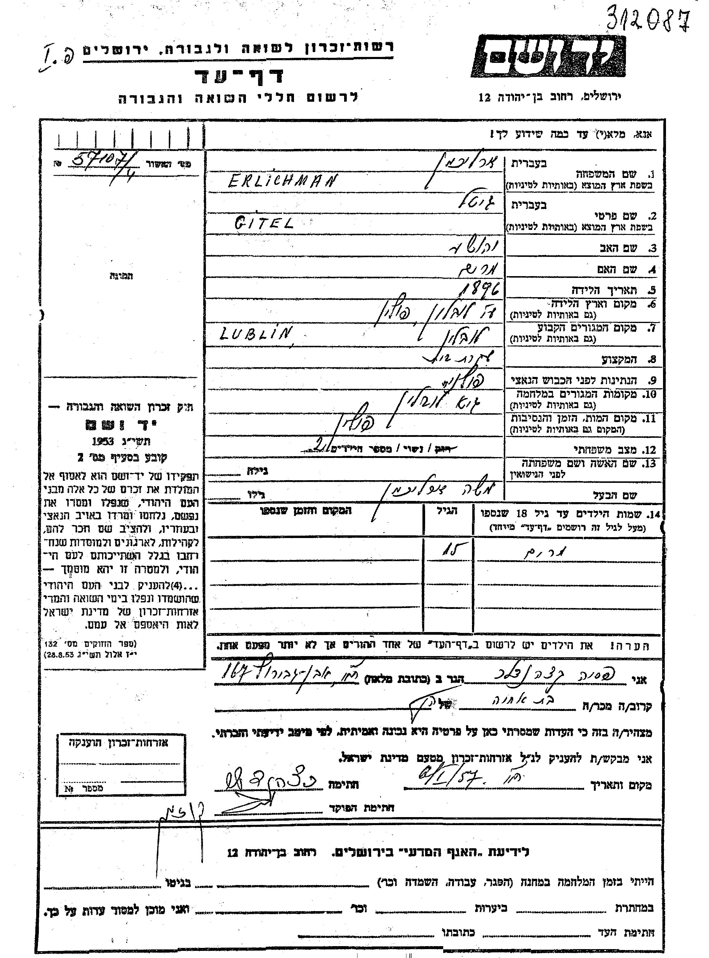 Erlichman Gitl 1887 Lublin, Pologne Feuille de témoignage