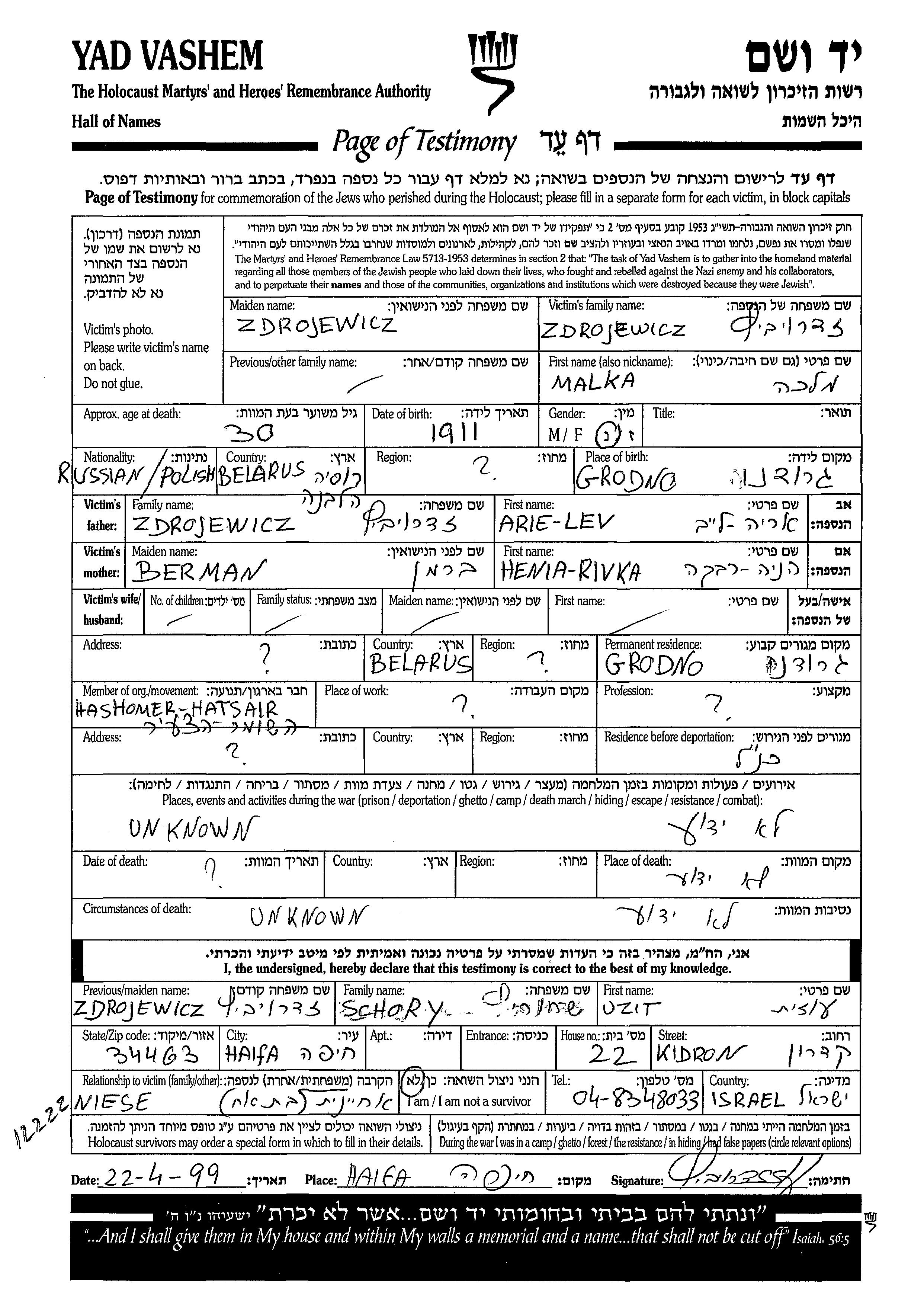 Zdrojewicz Malka 1911 Grodno, Pologne Feuille de témoignage