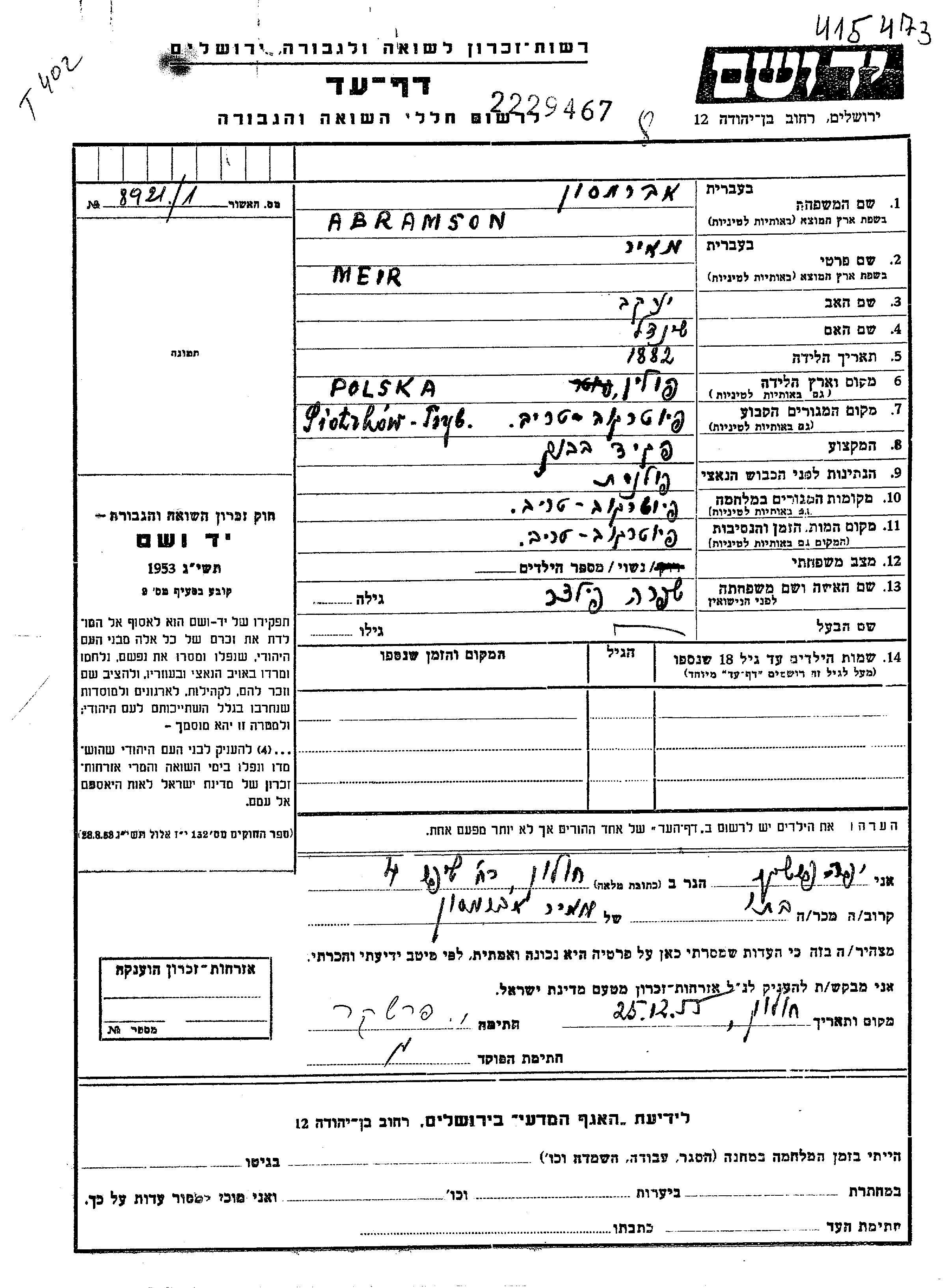 Abramson Meir 1882 Piotrkow Trybunalski, Pologne Feuille de témoignage