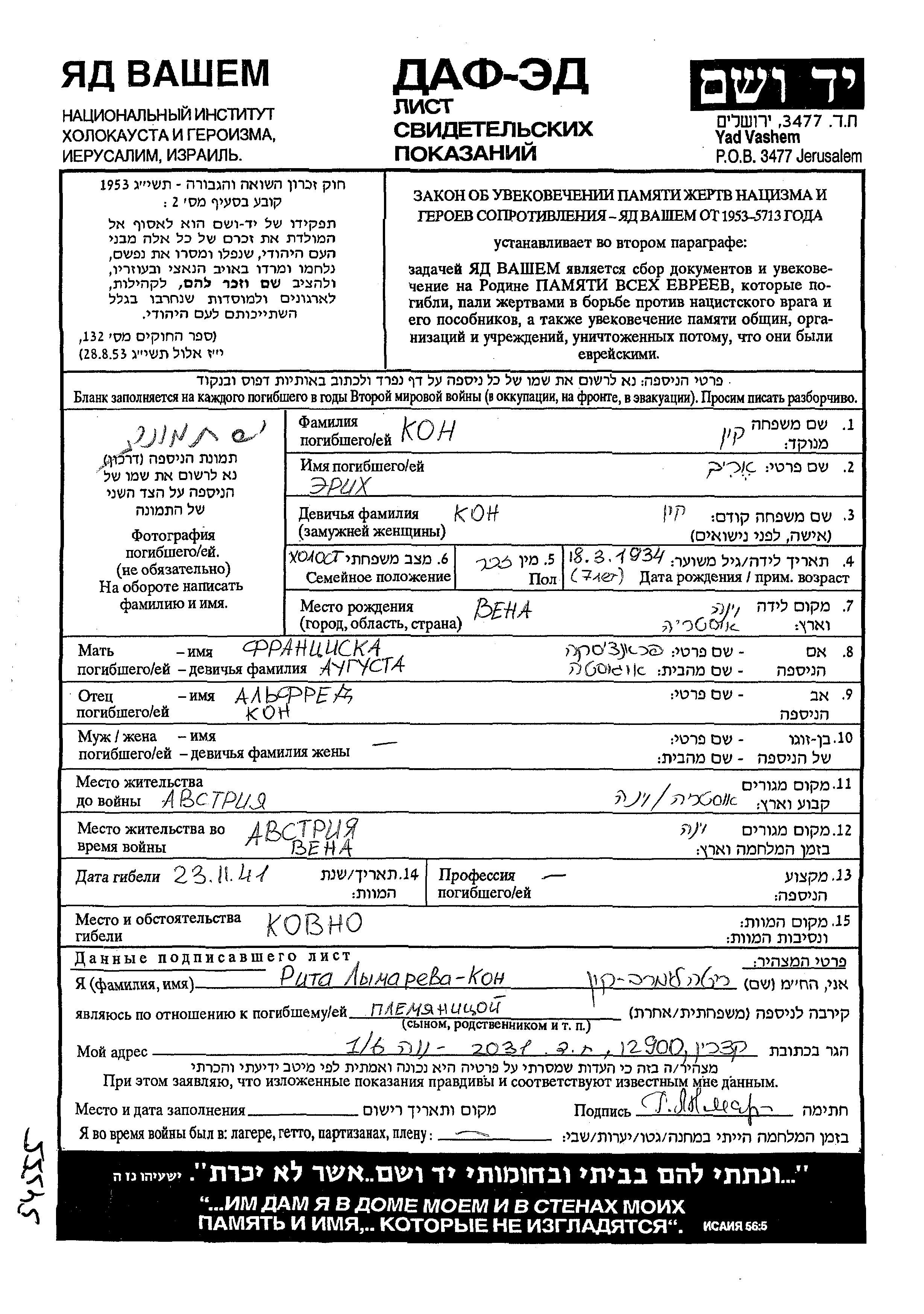 Kon Kun Erik 1934 Wien, Autriche Feuille de témoignage