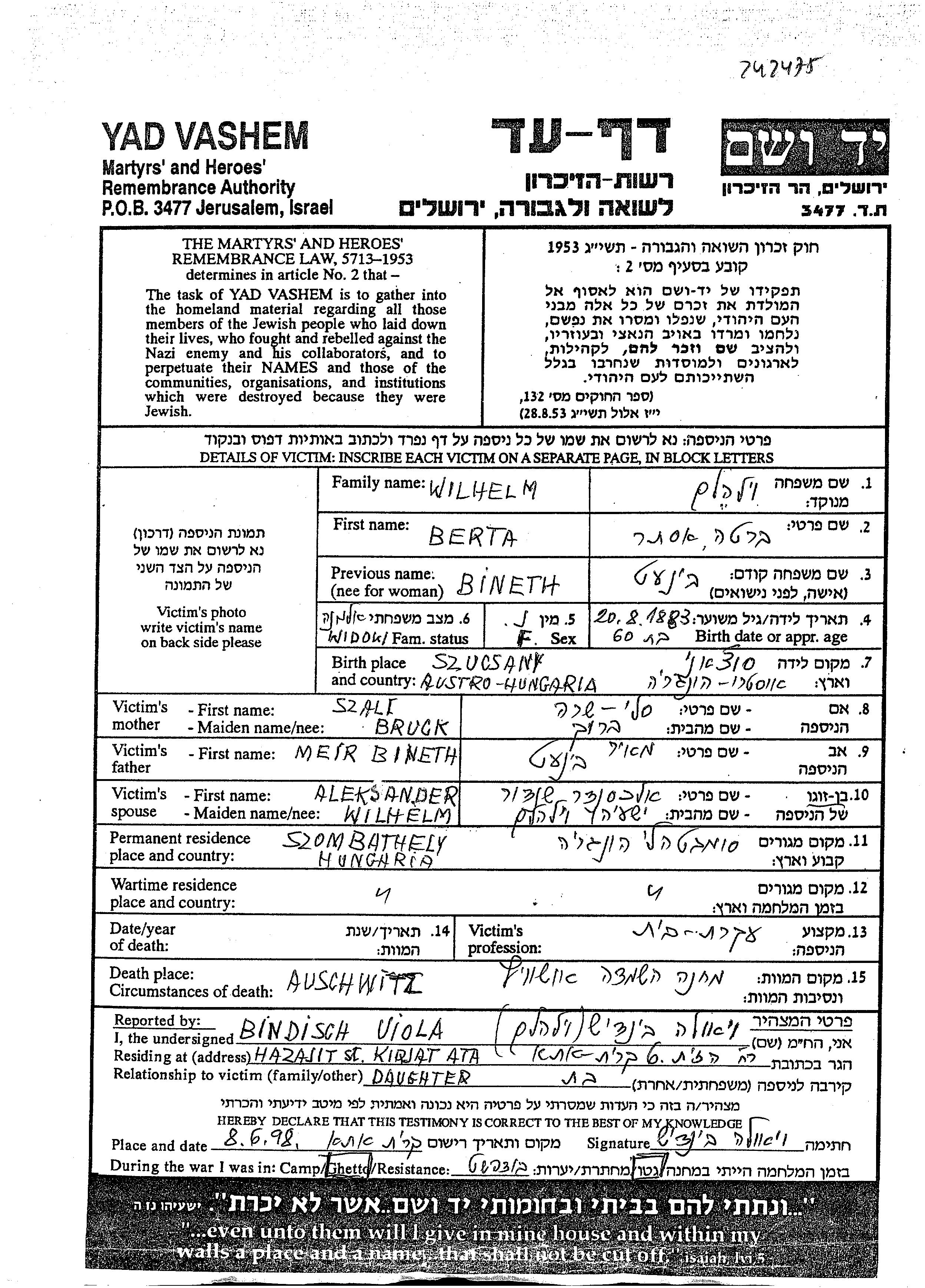 Berta Wilhelm née Bineth est née à Szucsany, Tchécoslovaquie en 1883. Elle était Femme au foyer. Avant la seconde guerre mondiale elle vivait à Szombathely, Hongrie.