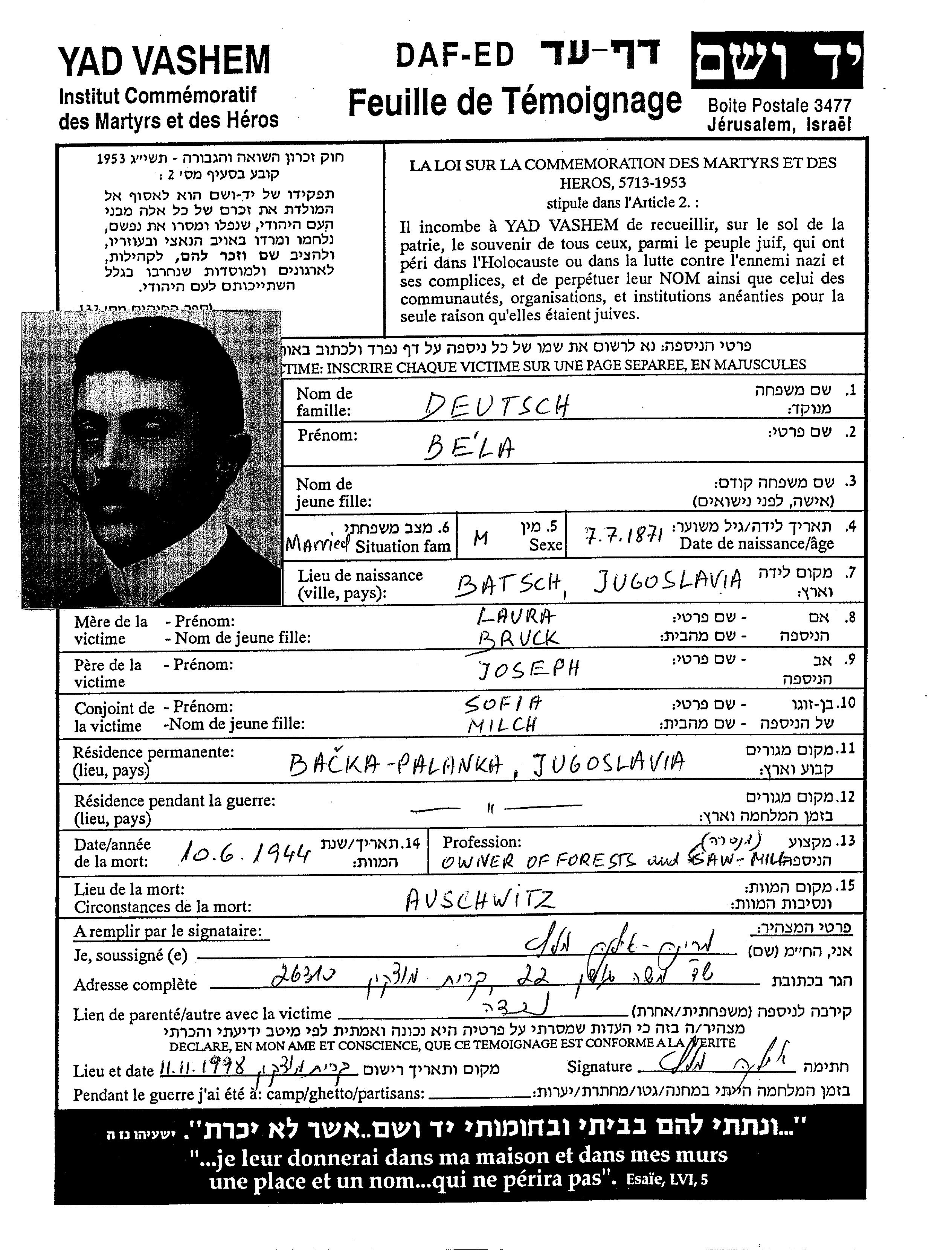 Bela Deutsch est né en 1871. Avant la seconde guerre mondiale il vivait à Backa Palanka, Yugoslavie.