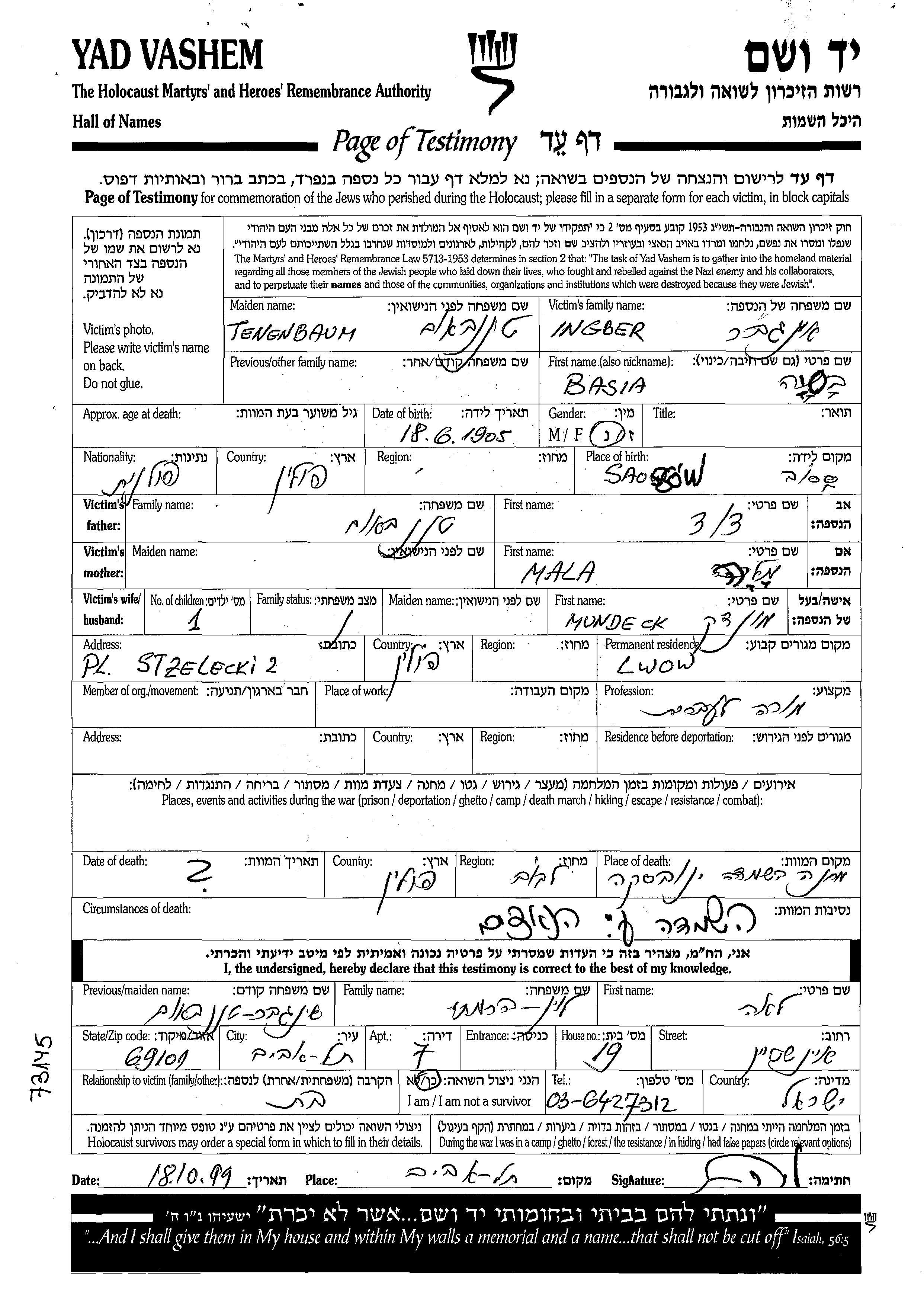 Tenenbaum Basia 1905 Lwow, Pologne Feuille de témoignage