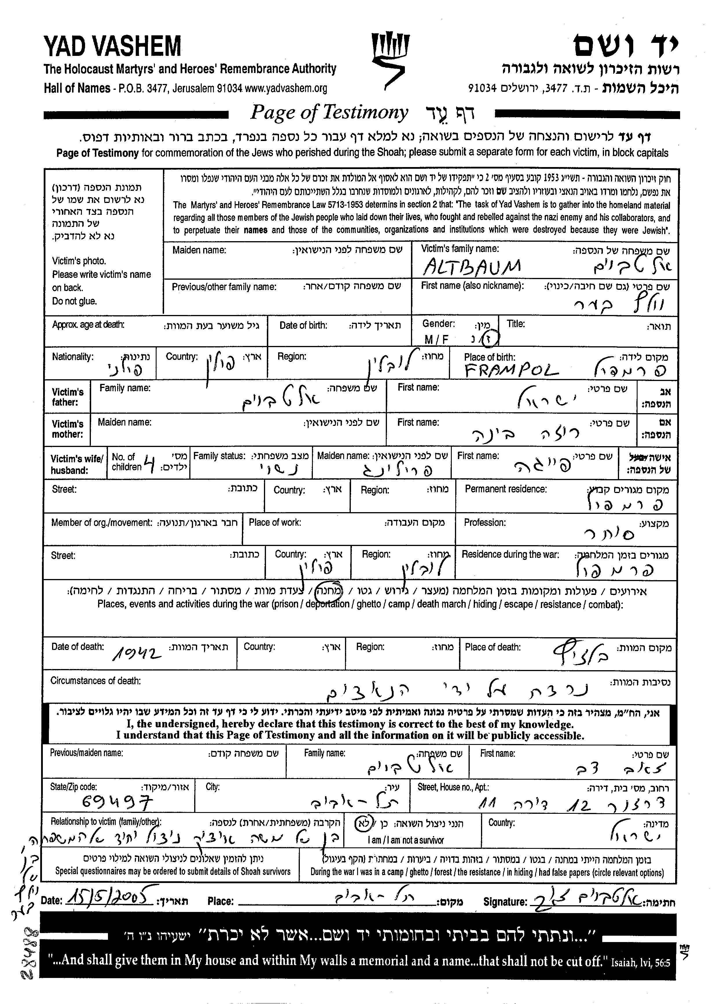 Ber Volf Altbaum est né à Frampol, Pologne. Il était Commerçant/e. Avant la seconde guerre mondiale il vivait à Frampol, Pologne.