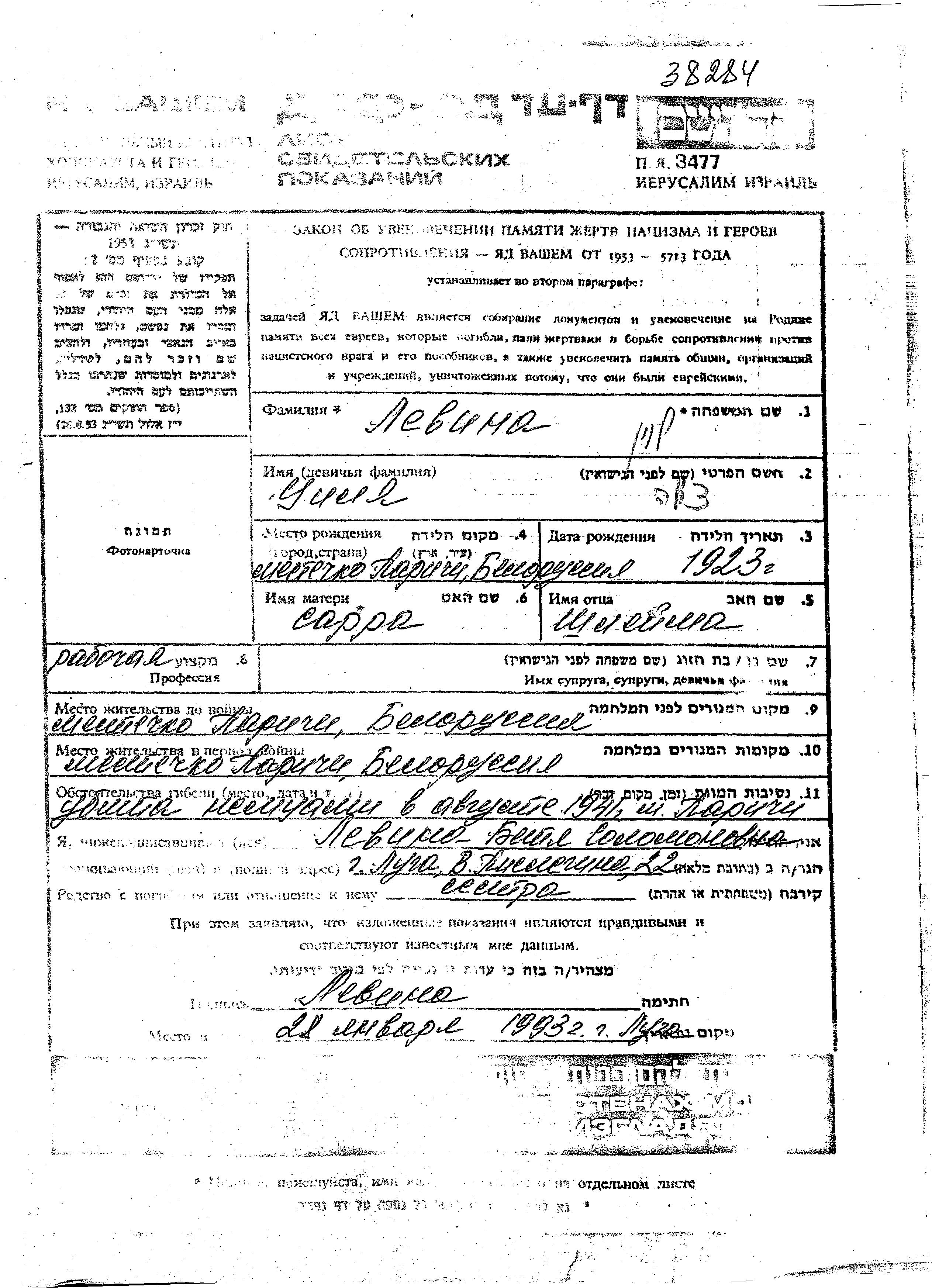 Levin Tzilia 1923 Parichi, Bélorussie (URSS) Feuille de témoignage