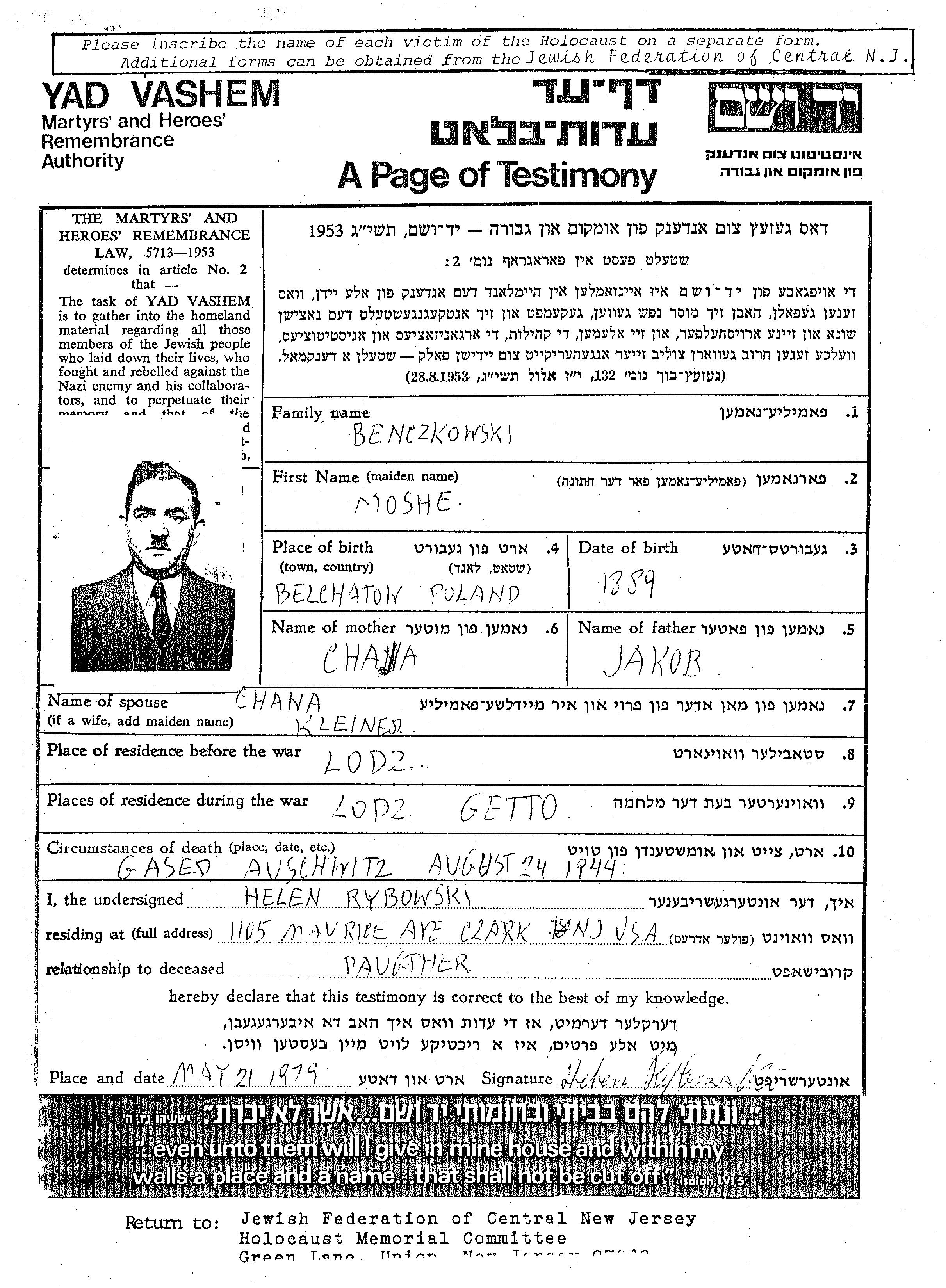 Benczkowski Moshe 1889 Lodz, Pologne Feuille de témoignage