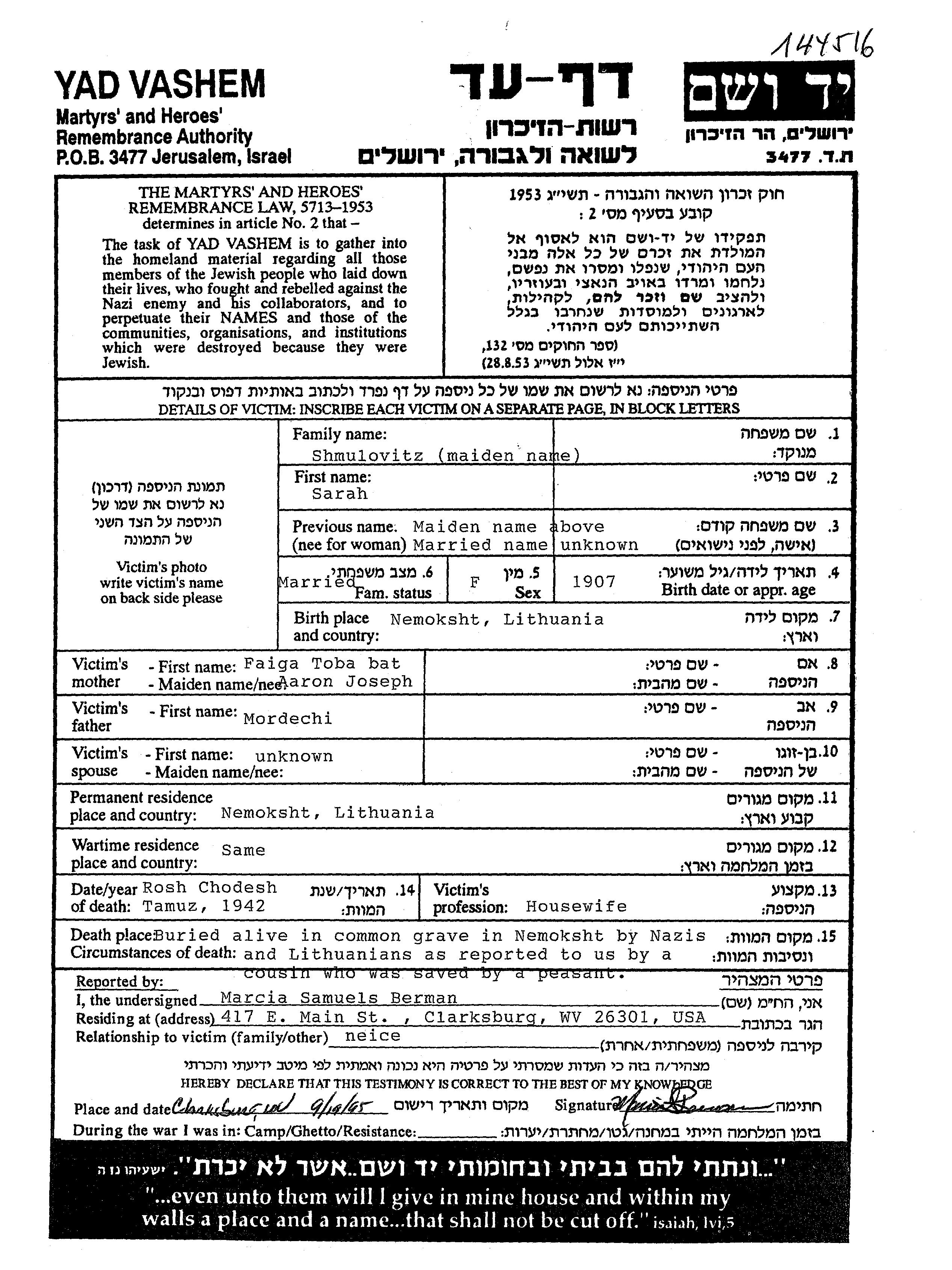 nom inconnu Sarah 1907 Nemoksht, Lituanie Feuille de témoignage