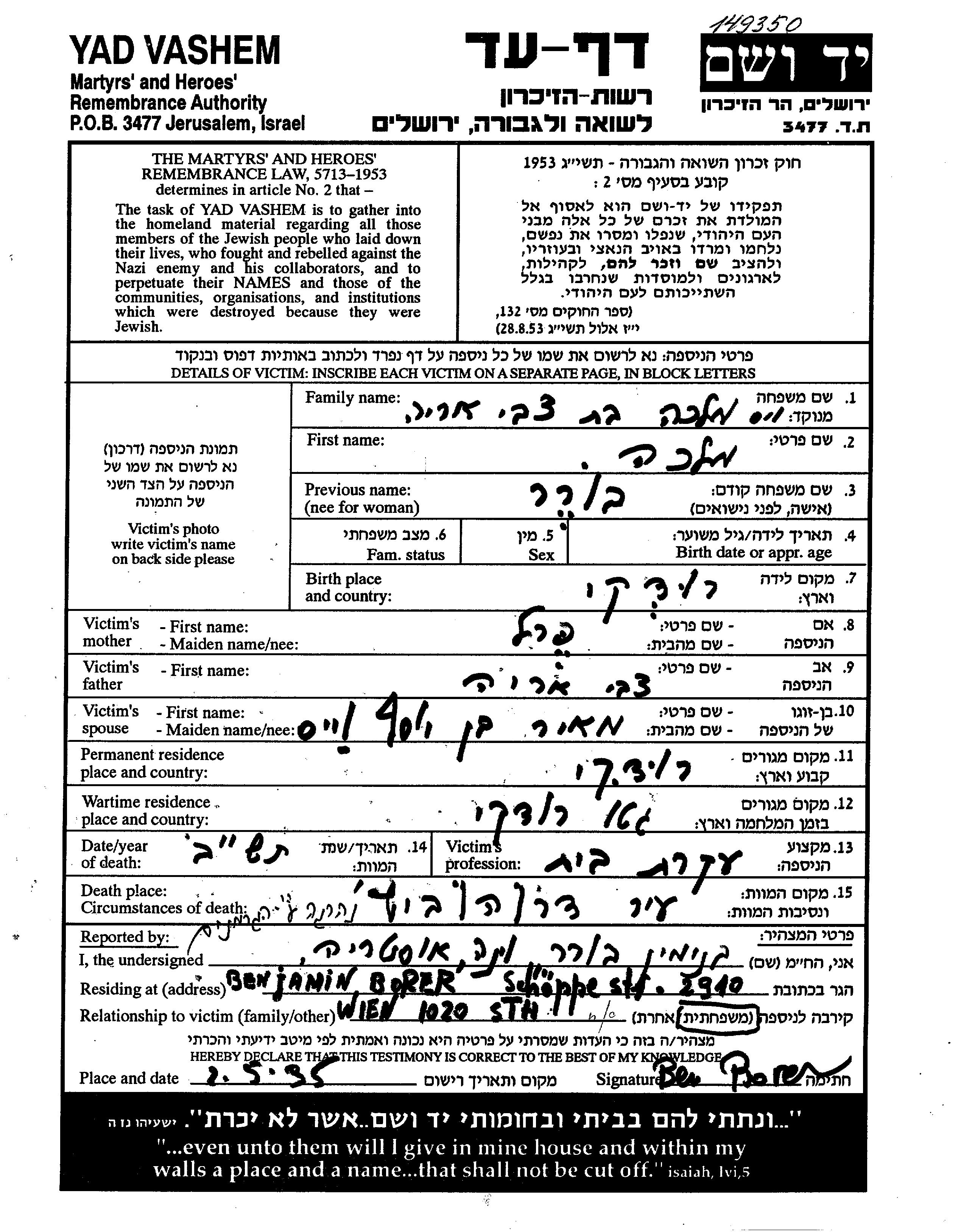 Malka Vais née Borer est née à Rudki, Pologne. Elle était Femme au foyer. Avant la seconde guerre mondiale elle vivait à Rudki, Pologne. Malka a été assassinée pendant la Shoah. Lieu de la mort: Drohobycz, Pologne en 1941.