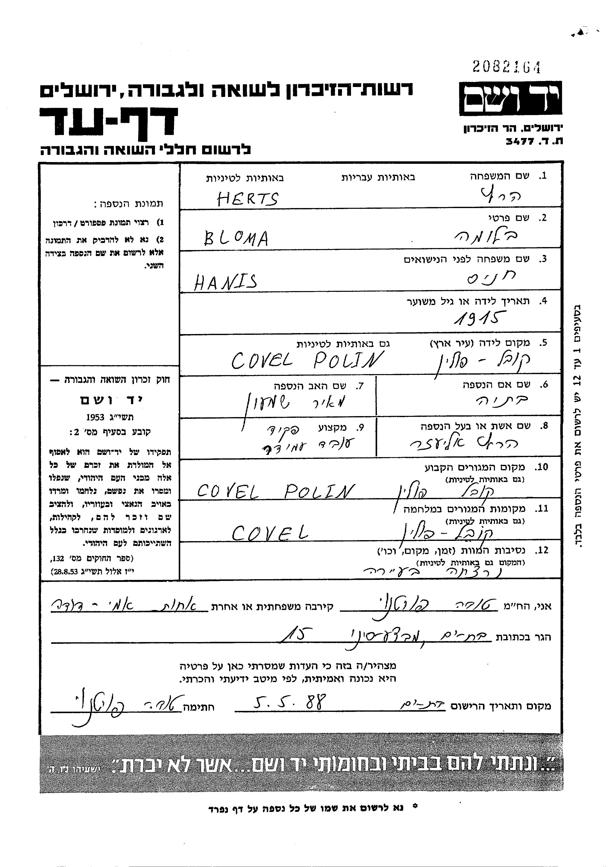 Herts Bloma Kowel, Pologne Feuille de témoignage