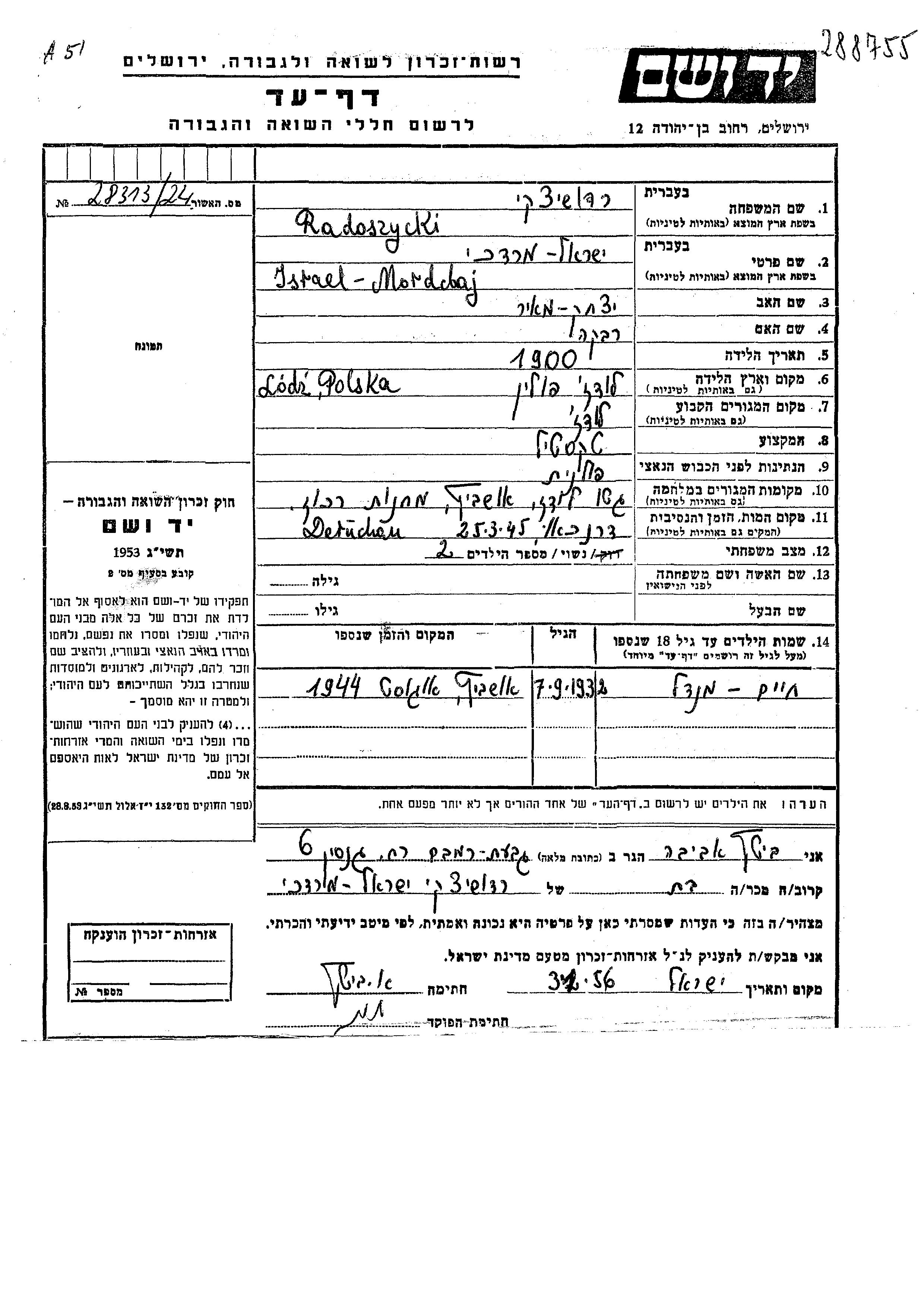 Radoszycki Israel Mordchaj 1900 Lodz, Pologne Feuille de témoignage