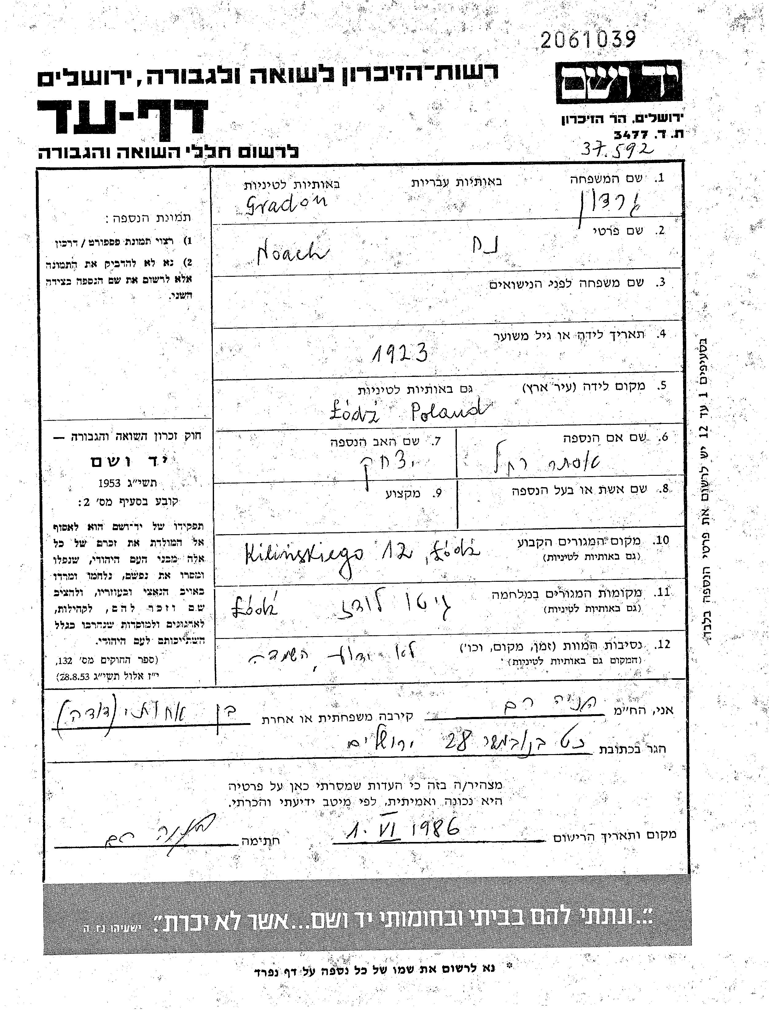 Gradon Noakh 1923 Lodz, Pologne Feuille de témoignage