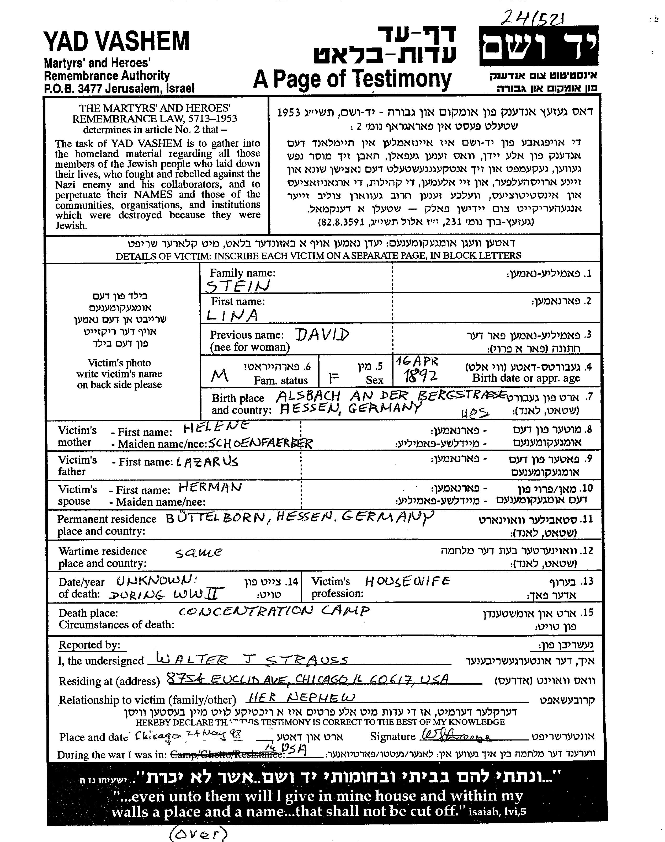 Lina Stein née David est née à Alsbach, Allemagne en 1892. Elle était Femme au foyer. Avant la seconde guerre mondiale elle vivait à Buettelborn, Allemagne.