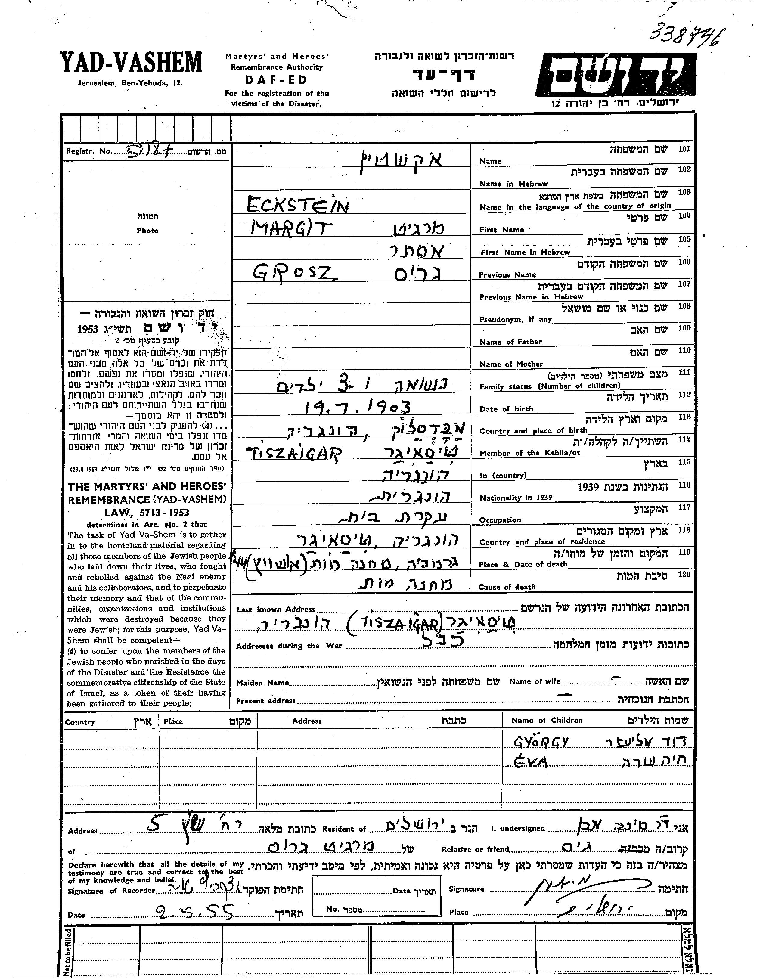Eckstein Margit 1903 Tiszaigar, Hongrie Feuille de témoignage