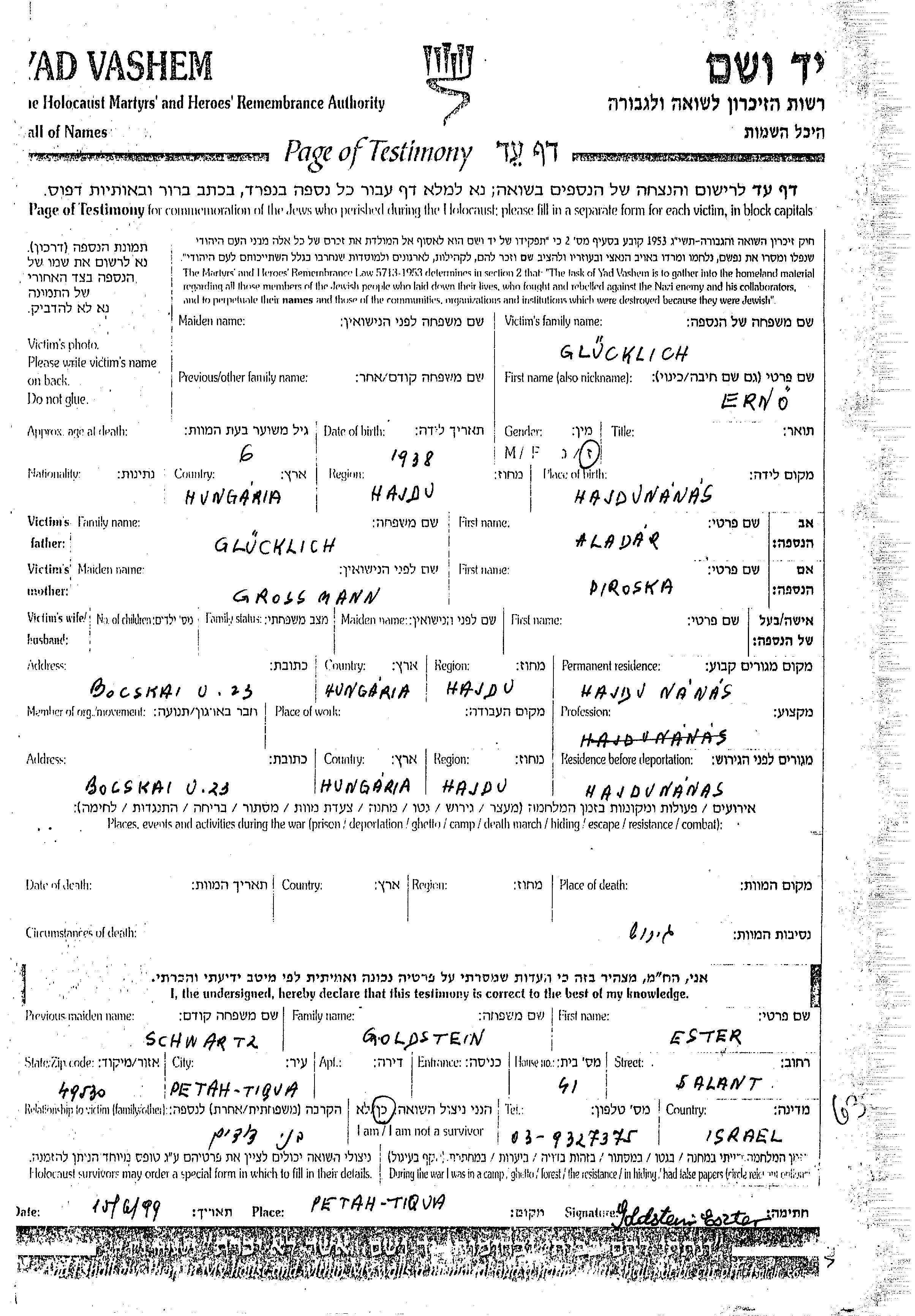 Glucklich Erno Erna 1938 Hajdunanas, Hongrie Feuille de témoignage