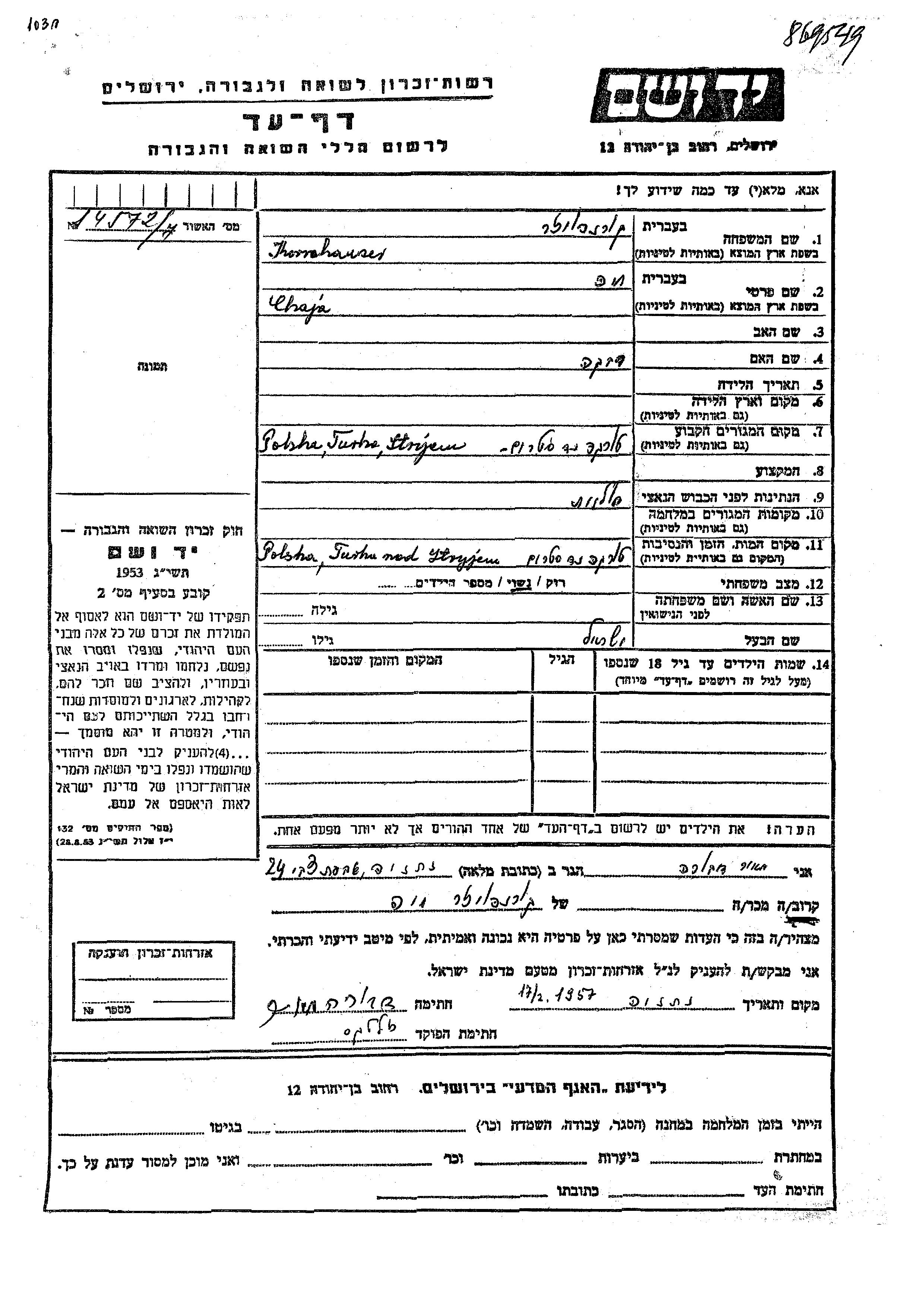 Kornhauser Chaja Turka nad Stryjem, Pologne Feuille de témoignage